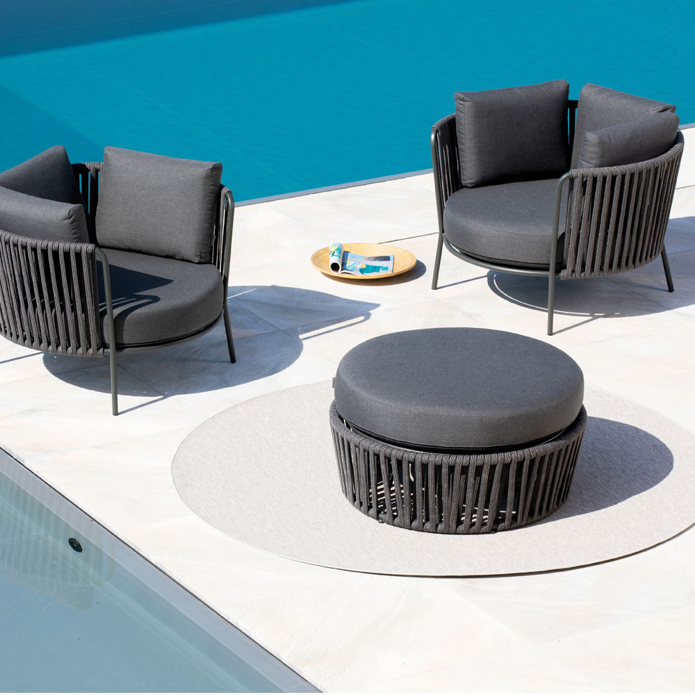 The contemporary design and the interweaving of basic geometric shapes create a dynamic and functional atmosphere . With this piece of furniture, any outdoor living room will be perceived as a fluid space that integrates perfectly into any type of outdoor space.
