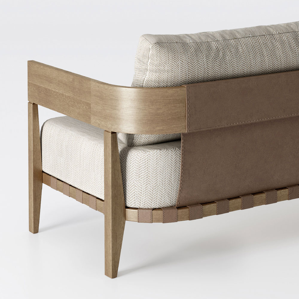Outdoor sofa entirely Made in Italy with seat and back cushions in padded fabric and weathered teak wood structure. The sofa is embellished in the seat structure and in the backrest with stitched leather . This product with delicate and essential lines is perfect for all those who love the modern and minimalist style. The organic shape and the sculptural legs blend together to create a simple element with harmonious proportions suitable for being inserted in any outdoor environment to give a charming atmosphere with simple lines and a retro taste. The materials used for the production guarantee quality and resistance even with the passage of time and make this furnishing accessory perfect for every situation and occasion of use.