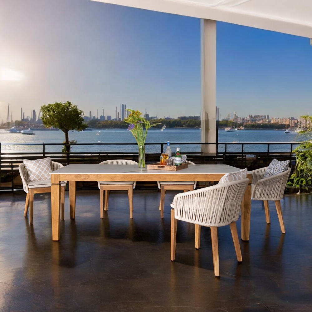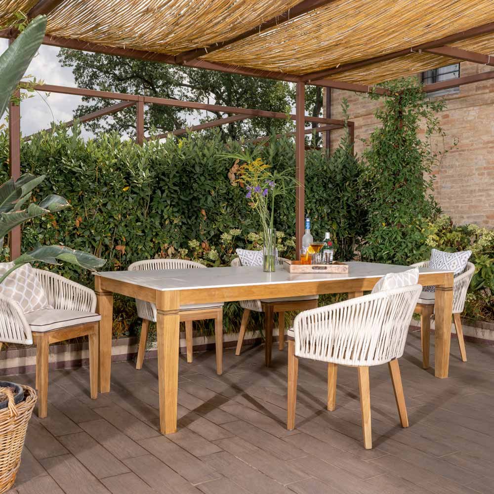 Outdoor table in natural teak wood and ceramic top.
