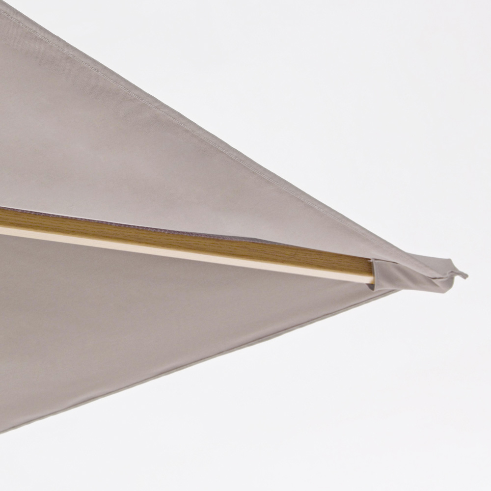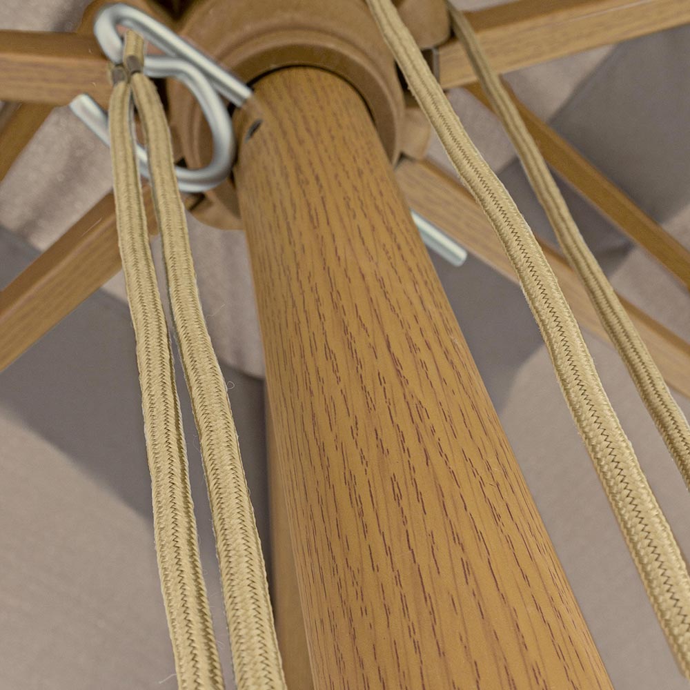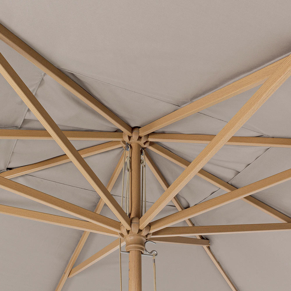 Aluminum structure with wood effect finish. Plastic crown. Pole Ø48 x 1.8 mm. 8 ribs 20x30 mm. 235 gr / m2 polyester sheet.