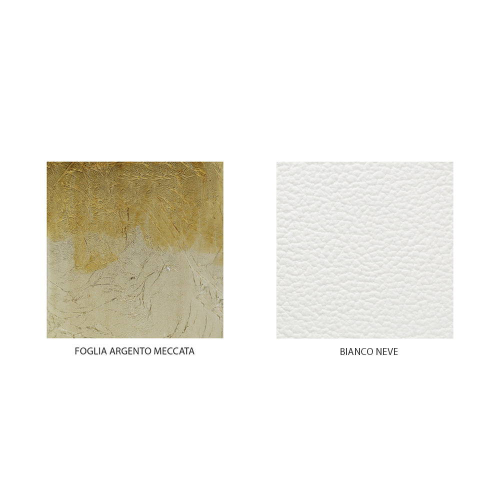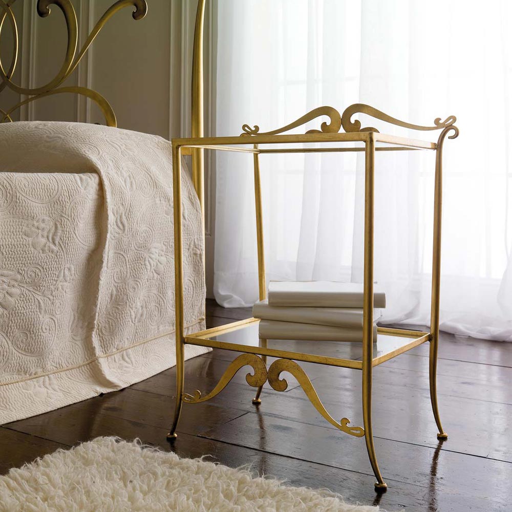 2 bedside tables made with solid iron structure in artisanal finish in meccata silver leaf or gold leaf and 2 glass tops .