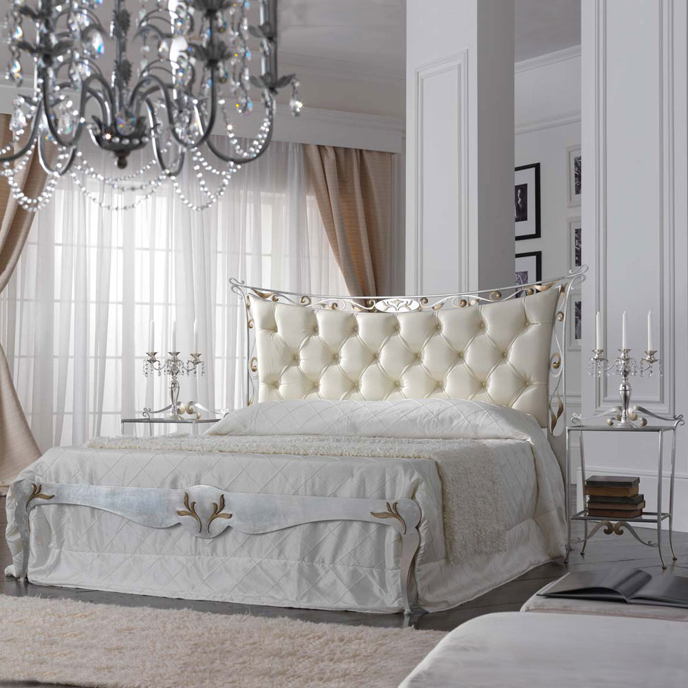 Double bed made with coordinated solid iron headboard and footboard in handcrafted leaf paint finish and real leather padding in snow white finish.
