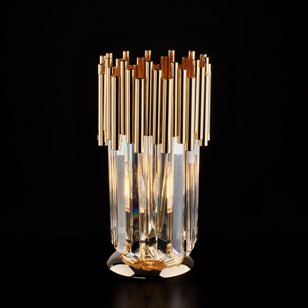 Elegant and precious, this luxury gilded iron table lamp with rhinestones is a refined lighting accessory designed to enhance spaces with a warm, dramatic light. The vertical structure, featuring cylindrical golden elements alternating with clear rhinestone inserts , creates a captivating play of reflections that enhances the space even when the light is off.