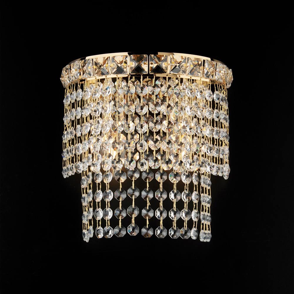 Elegant and dazzling, this luxury wall light in iron and gold-plated brass with rhinestones is a refined lighting element designed to embellish walls with a warm, enveloping light. The compact structure, embellished with cascades of luminous rhinestones , creates a suggestive play of reflections that gives the room a sophisticated and charming atmosphere.