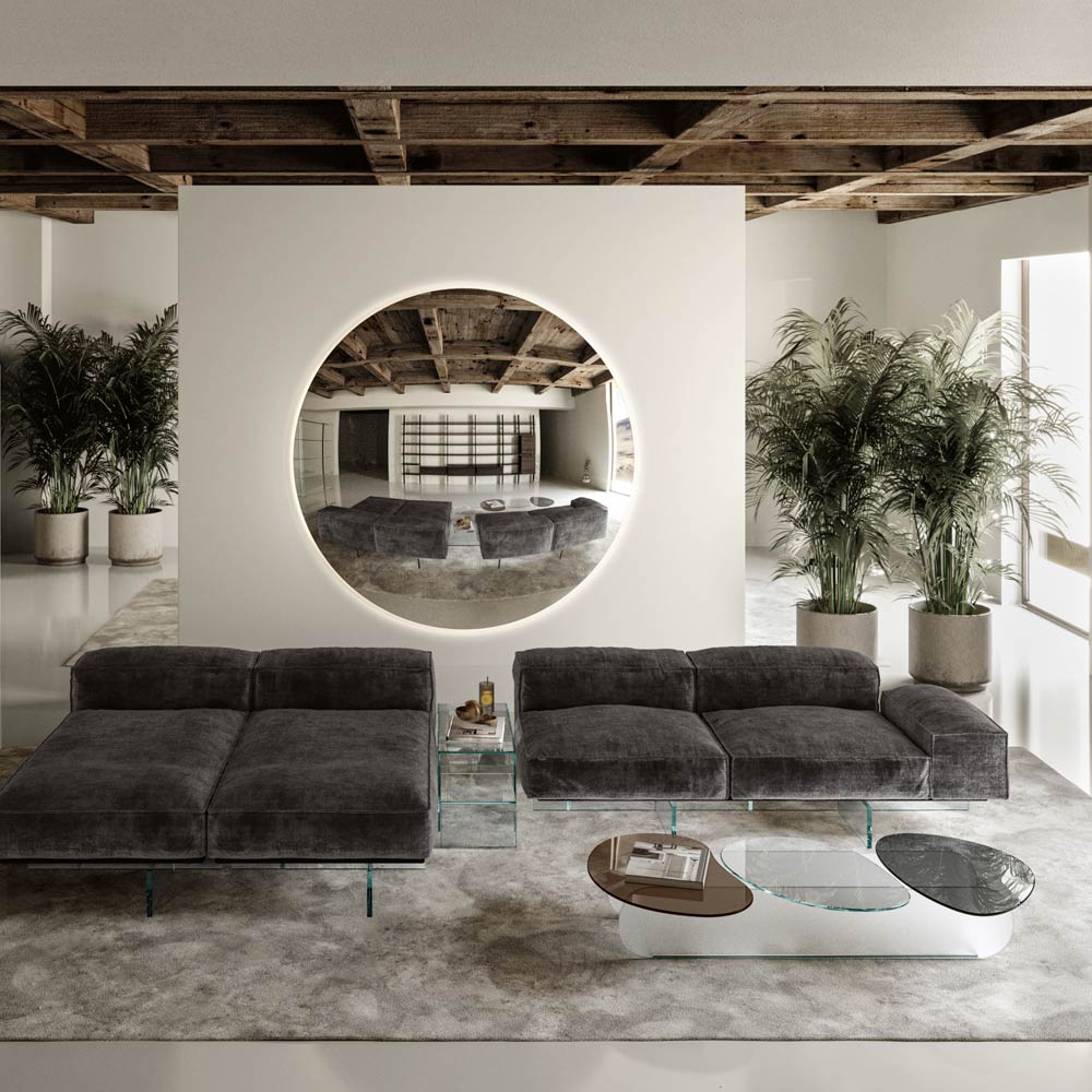 This coffee table presents itself as a functional work of art that combines elegance and versatility in a single sophisticated design. Glass surfaces blend harmoniously with rounded elements , creating a visual contrast that is both eye-catching and practical.