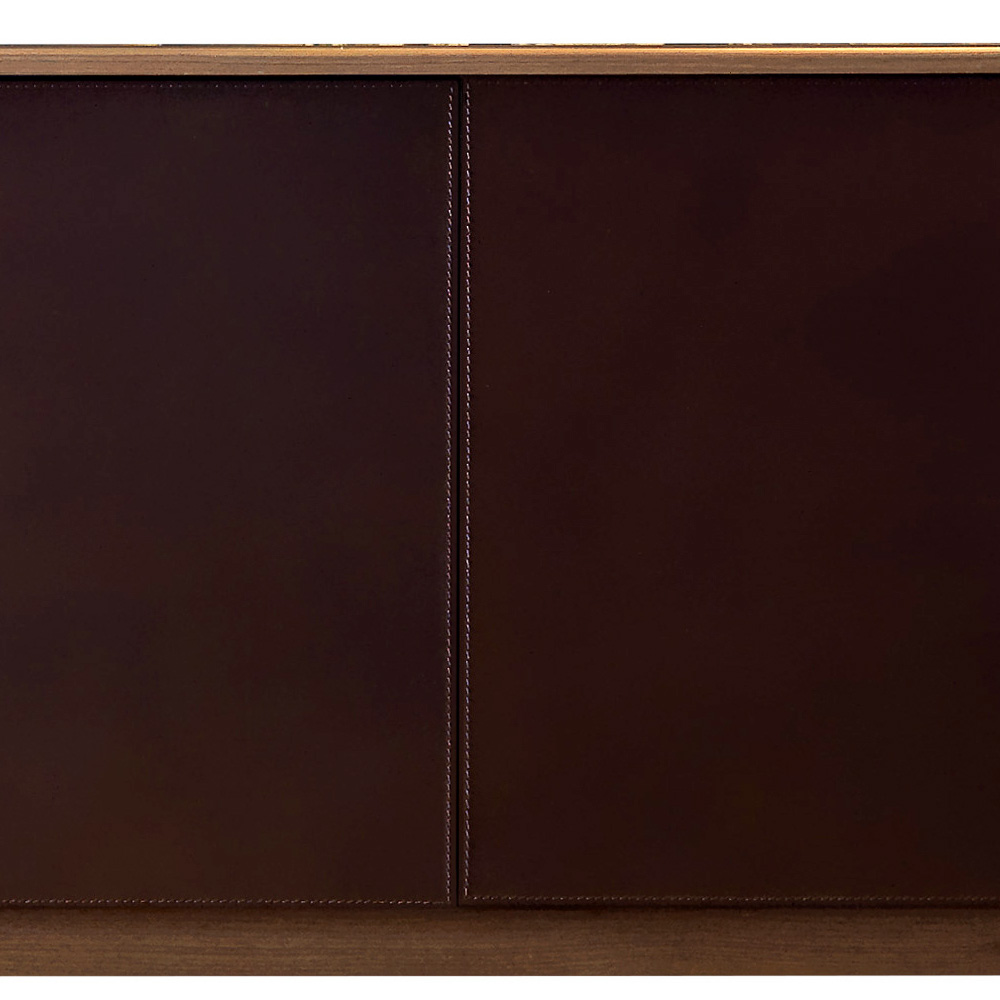 The front and the inside of the drawers are covered in natural leather, while in the central part there are shelves in veneered plywood with canaletto walnut.