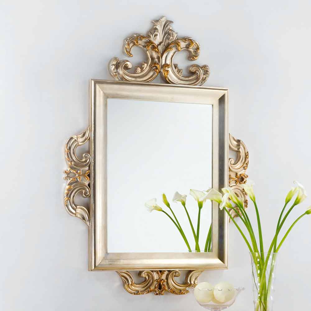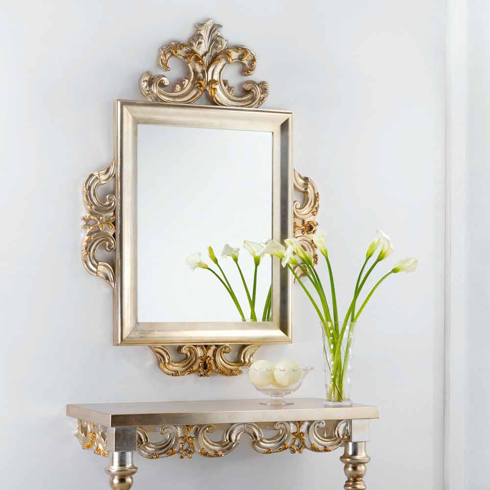 The Guy mirror is characterized by a craftsmanship carried out using quality materials and using the experience of skilled Italian artisans. The frame is made of wood decorated with carvings. Mecca silver leaf finish. Crystal mirror, 4mm thick. Made in Italy.