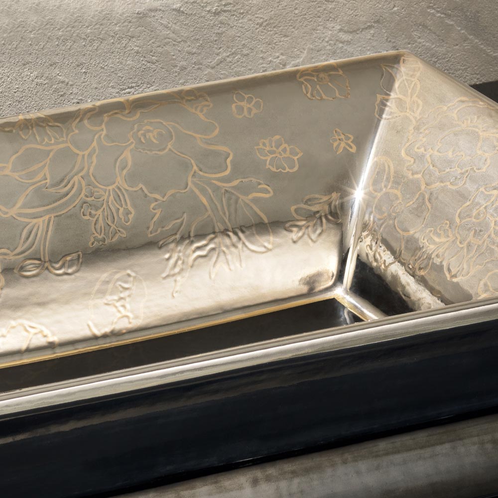 This element was designed and created to give the bathroom an elegant and refined touch, unique in its kind. It is a sink with a great visual impact, which becomes the protagonist of the room and, thanks to the possibility of choosing the design of the decoration , responds to different design and style needs. It is a product made by expert Italian hands who, one step after another, cooking after cooking, have created a product with all the quality of Made in Italy.