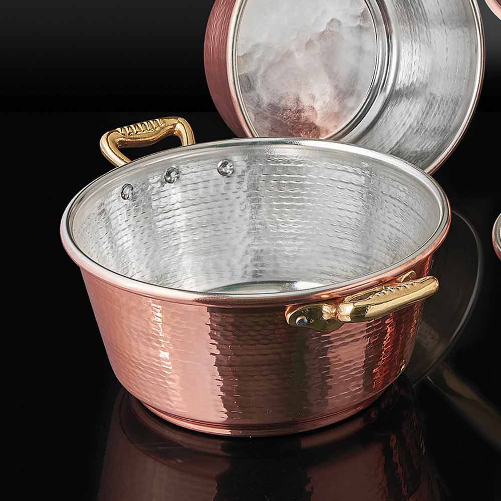 materials of excellent quality. So the copper used is pure copper, with the right physical qualities for perfect modeling. The brass for the handles comes from individual first choice ingots for artisanal casting and the tin used is 100% pure virgin suitable for food use, in compliance with the regulations and with a certificate of analysis.
