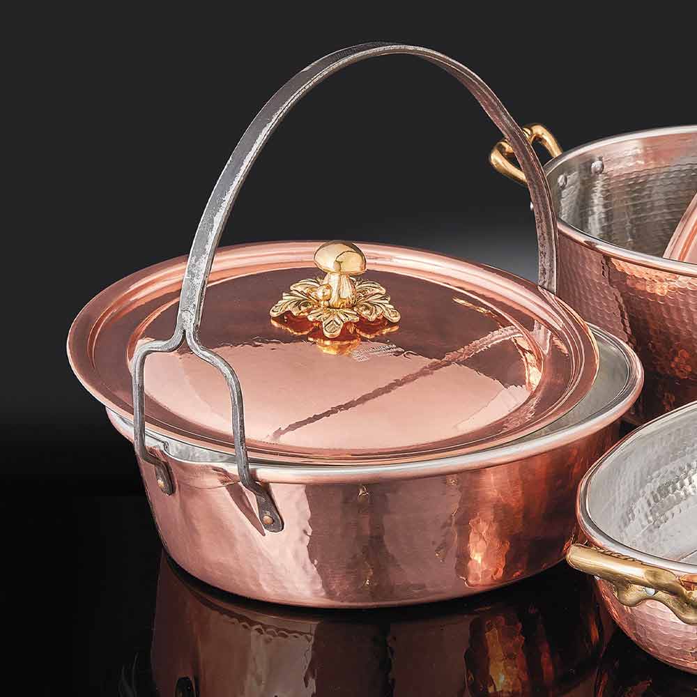 The hand-hammered solid copper casserole with lid and practical arched handle is ideal for cooking risotto, Ischia-style rabbit, chicken, braised meats, and is generally suitable for slow cooking.