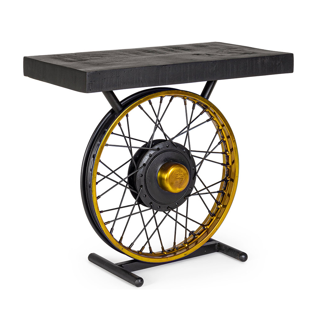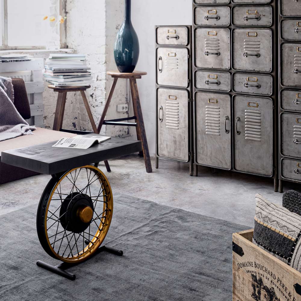 Coffee table for the living room in steel and mango wood industrial design with wheel.