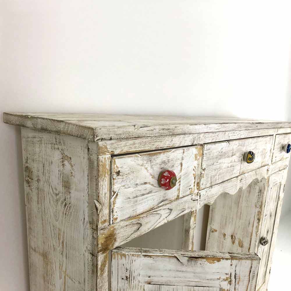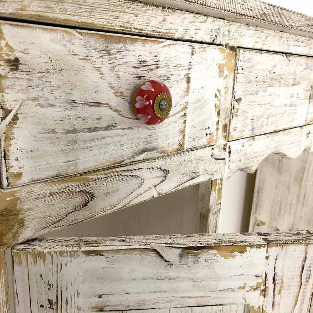 Console in solid fir wood entirely handmade in Italy and characterized by the wonderful flame-burned and whitewashed flayed finish. Its structure includes 2 doors with internal shelf and 3 drawers which are completed with special hand-painted ceramic knobs allowing you to have perfectly organized spaces.