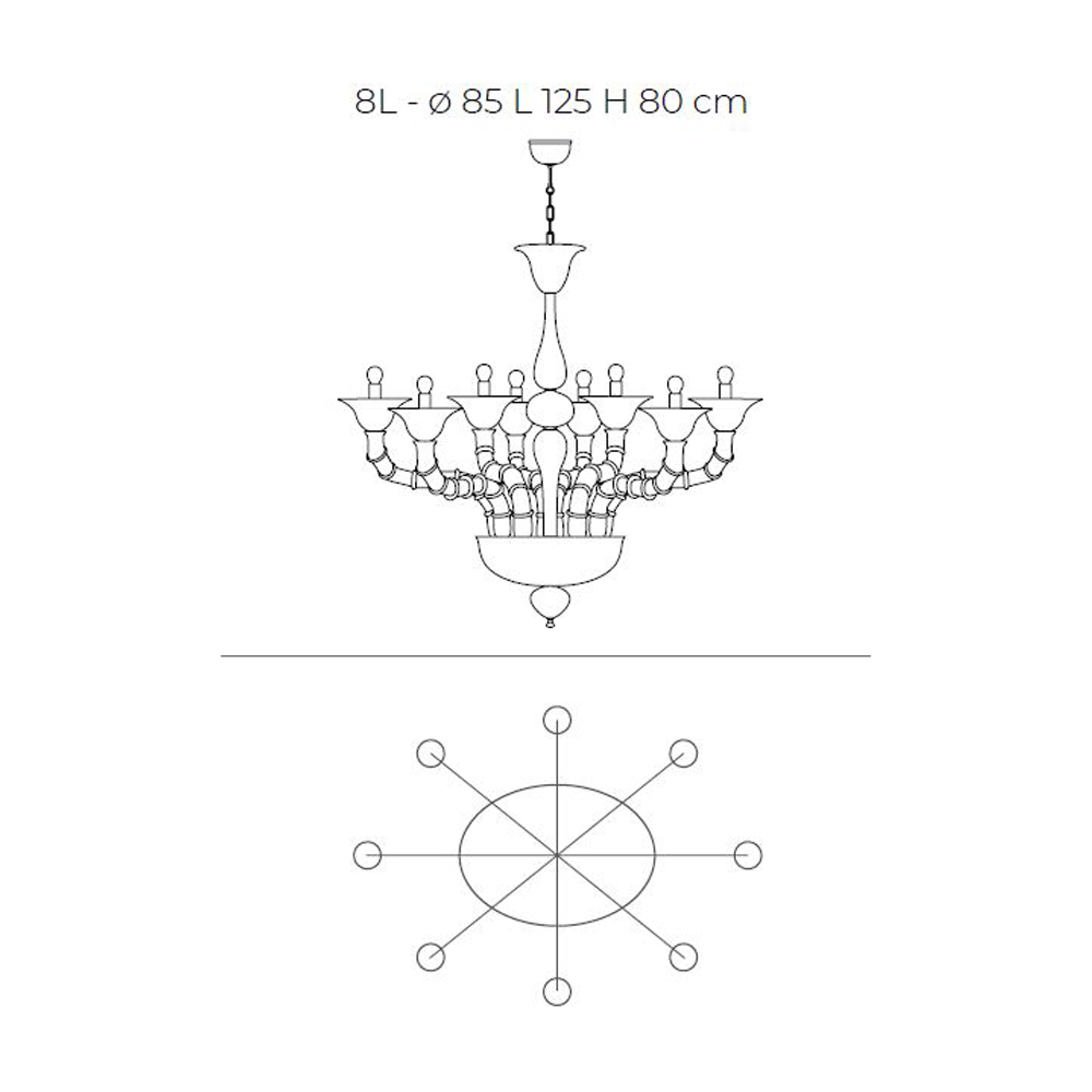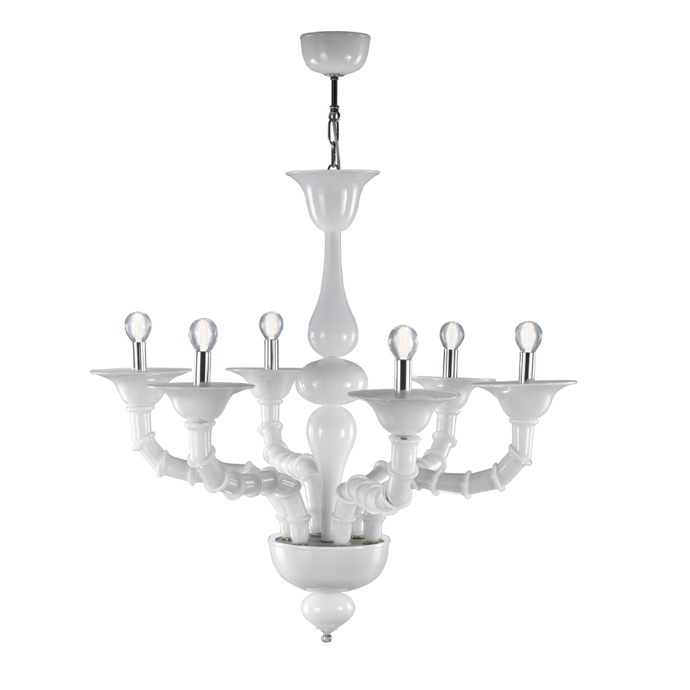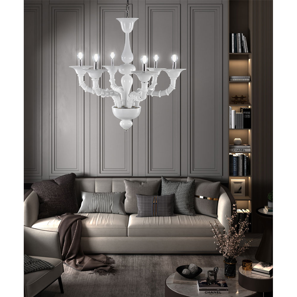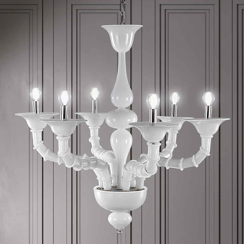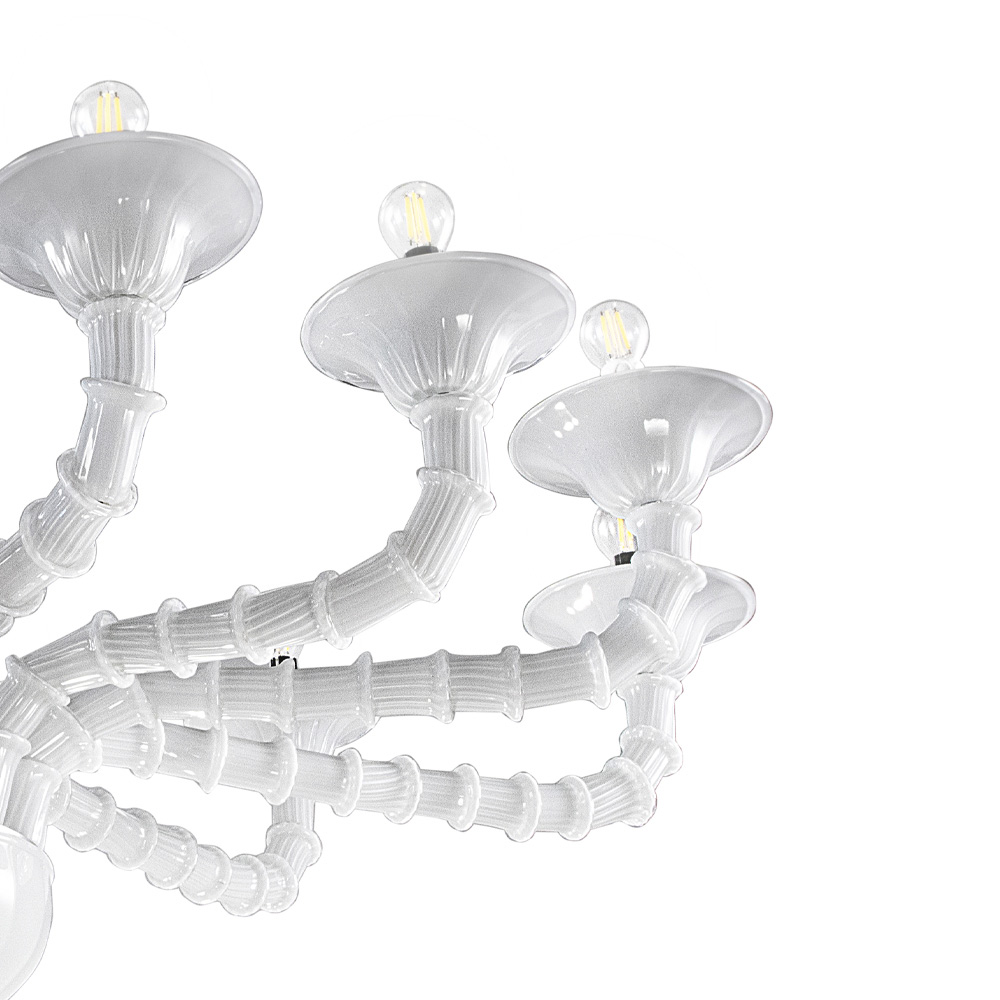 of hand-blown white Rezzonico glass designed to complete large areas of the house such as dining rooms or living rooms, giving life to high-quality lighting with an intriguing personality. The length of the arms is made possible thanks to the particular technique defined as "bossole" which consists in fitting several glass parts together giving proof of