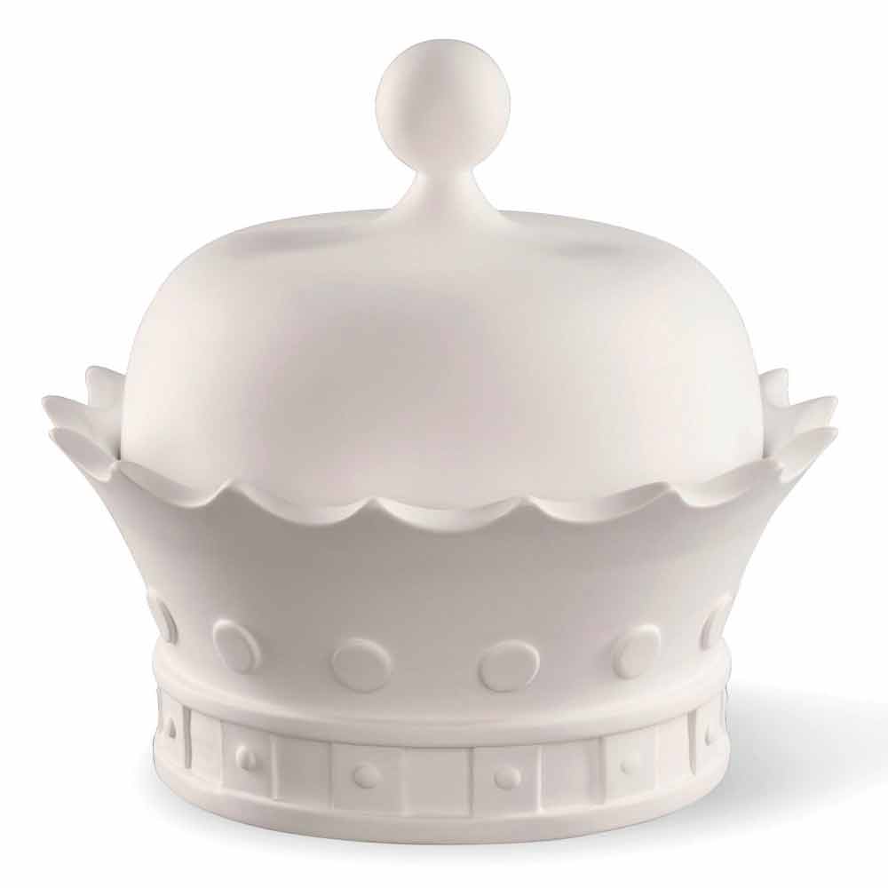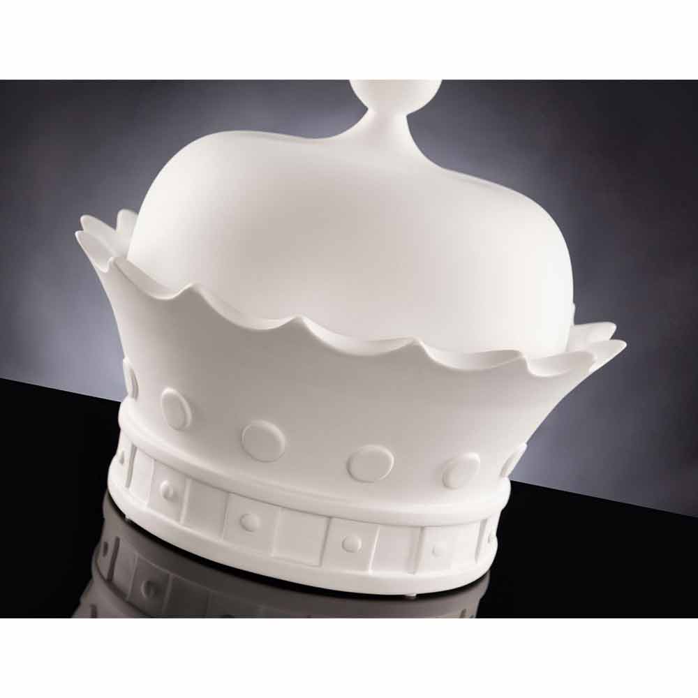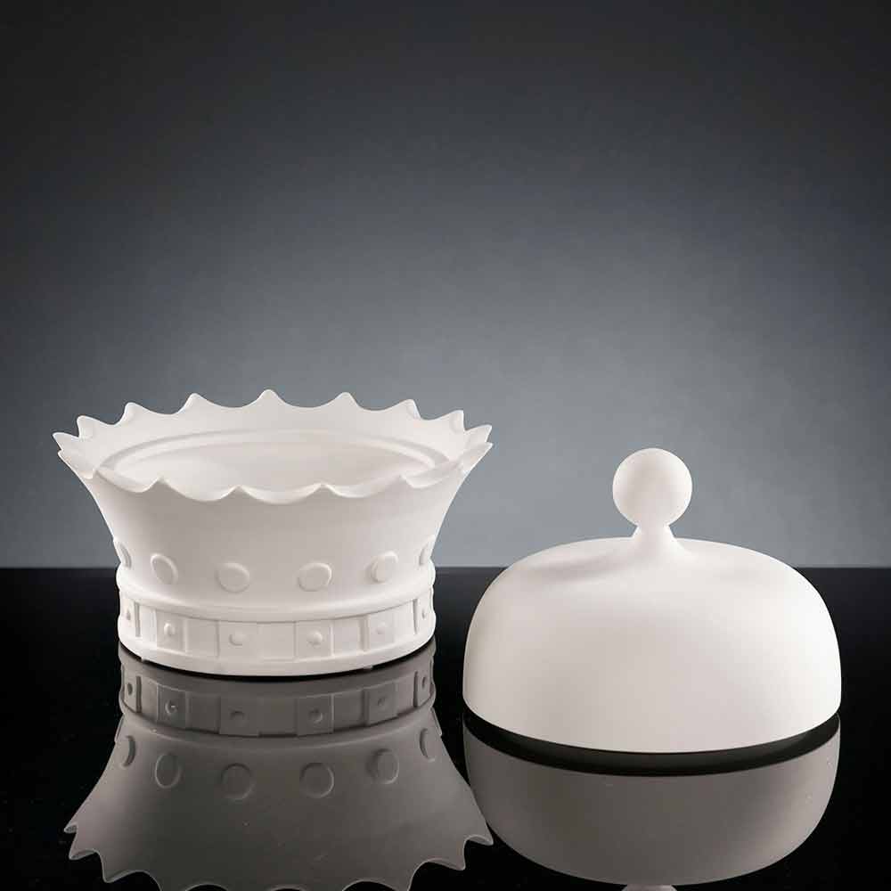 Decorative statuette in the shape of a king's crown with opening, made in Italy in white hand-made ceramic. An eccentric and elegant ornament at the same time capable of completing the surrounding furnishings by creating a wonderful harmony that embodies modernity and design . Its original and creative shape is ideal for those who love to enrich their domestic spaces with elements characterized by an original and unique soul while offering a small space in which to cram and organize some objects thanks to the practical compartment positioned under the lid.