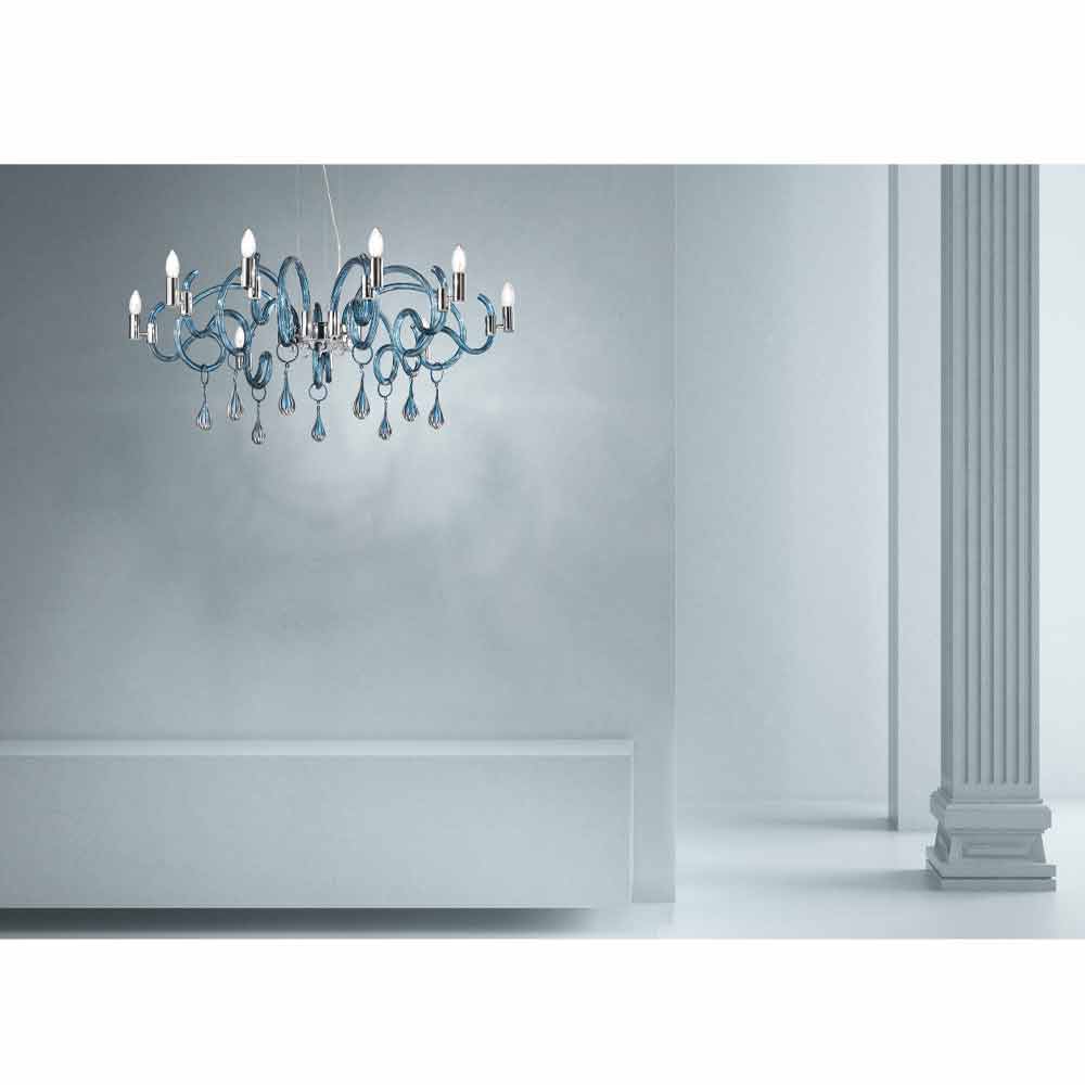 Majestic 9-light chandelier handcrafted in Italy in blue Venetian glass with details in polished chrome metal . The strong decorative value of this elegant complement with an eclectic style is defined through a game of curves and transparencies , capable of enriching and illuminating both contemporary and classic spaces with personality for an exclusive furniture . The wonderful hanging decorations enrich the figure by recreating the feeling of real raindrops and giving dynamism and originality to the chandelier for a result with an impressive scenographic impact .