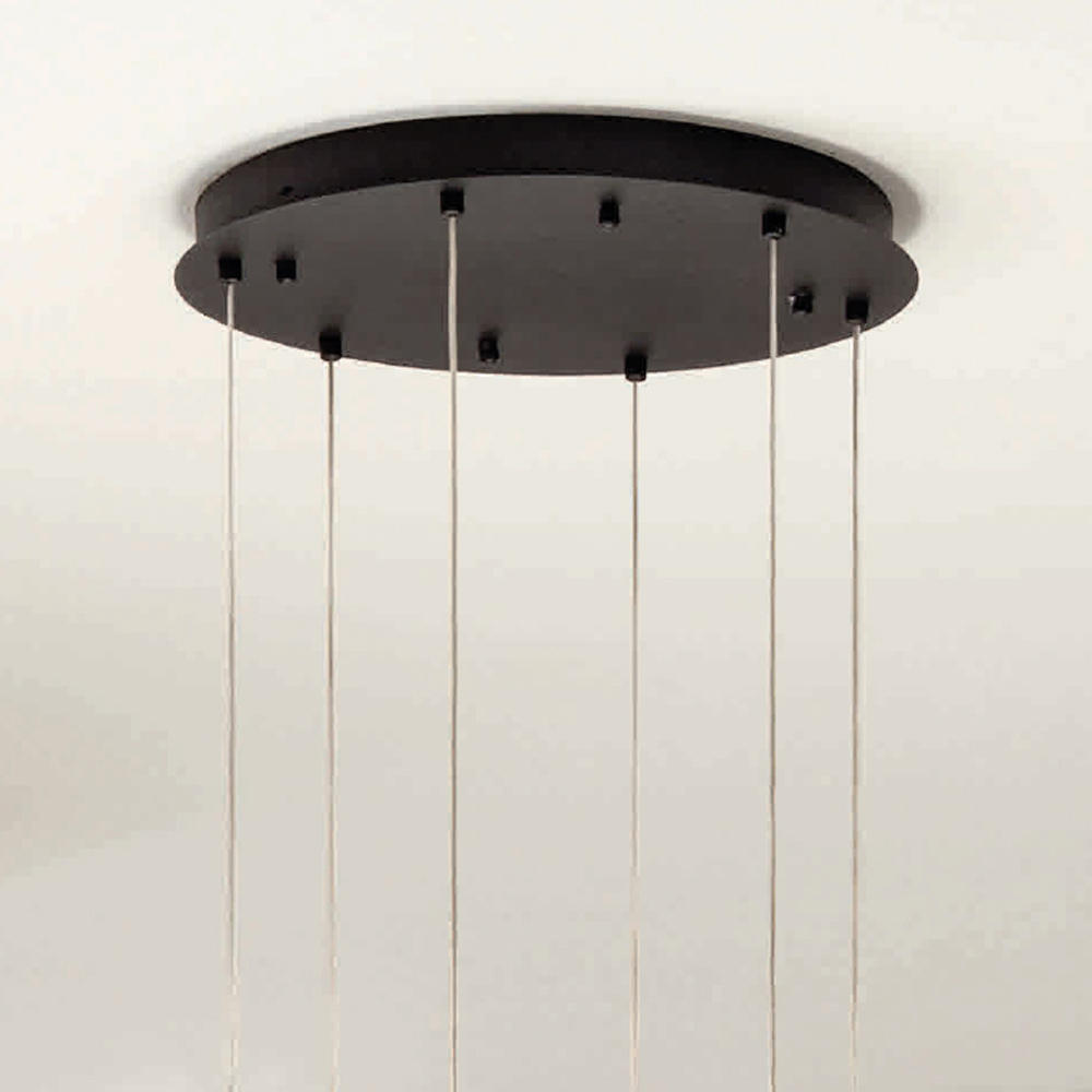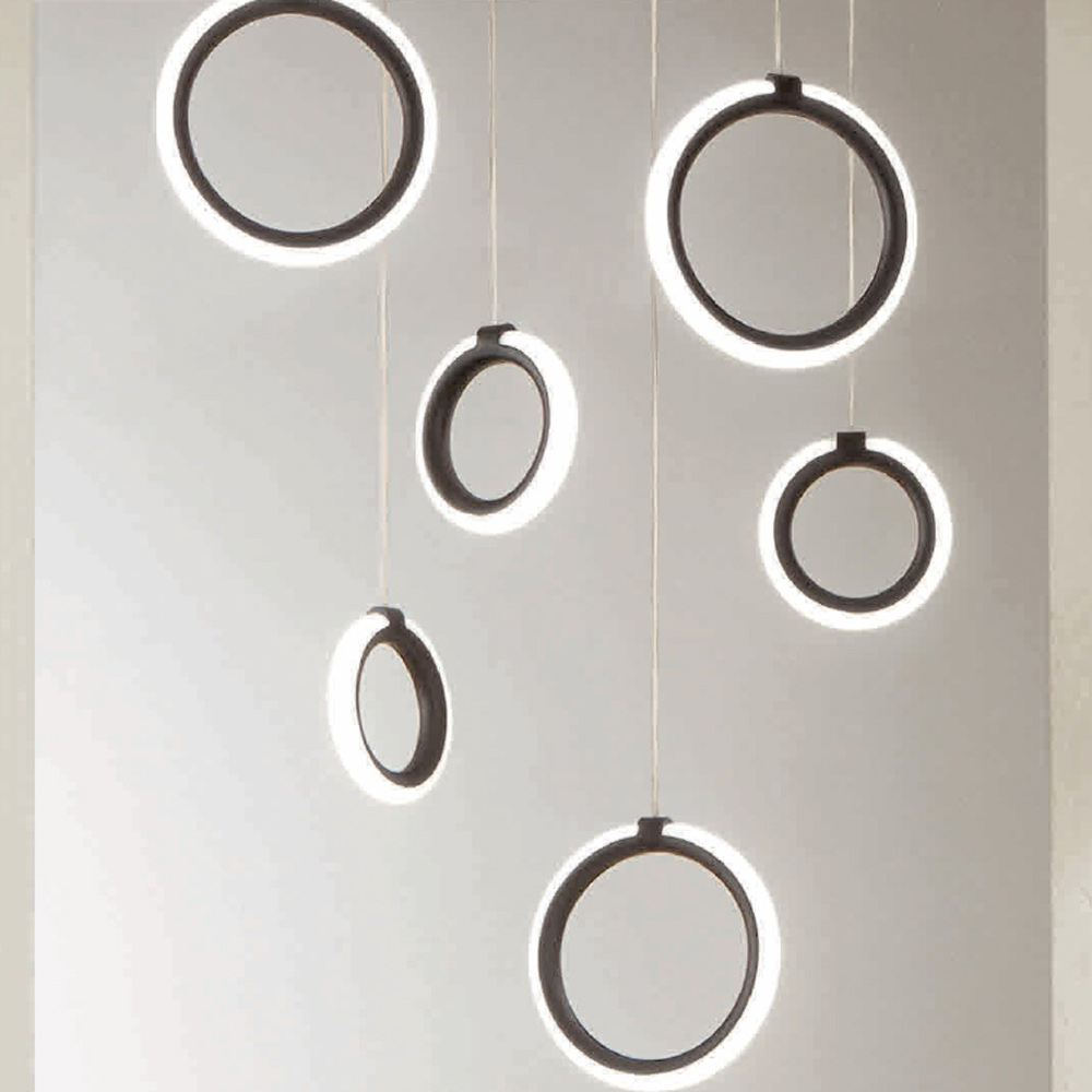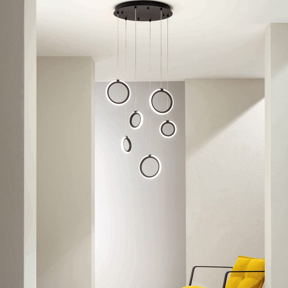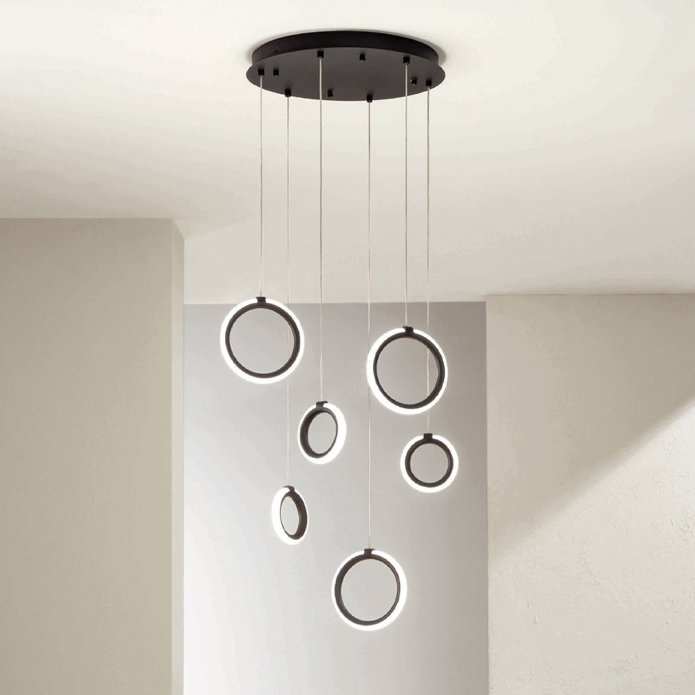 Chandelier entirely produced in Italy made of painted metal in black finish with adjustable length cables and 6 dimmable circle LED lights .