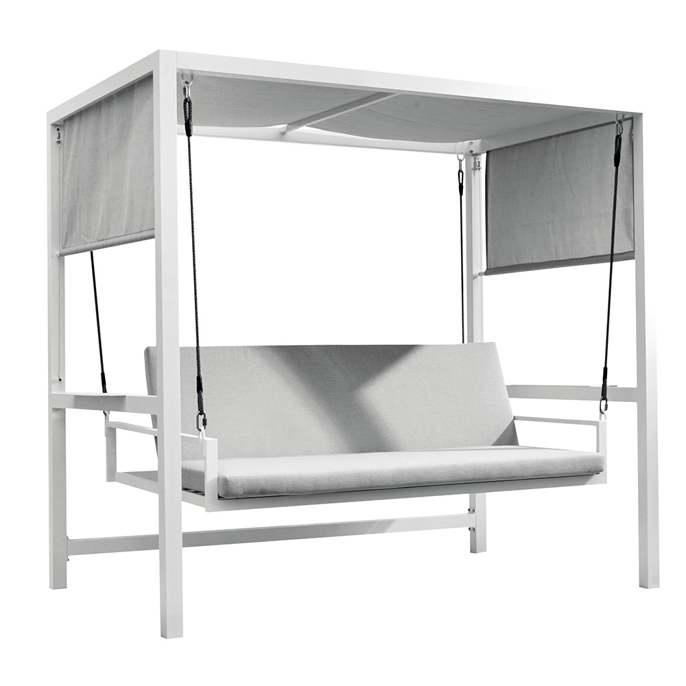 Garden swing made of white painted aluminum with 190 gr olefin fabric cushions in light gray color. This outdoor swing is equipped with a reclining backrest which makes it ideal for creating a relaxing atmosphere and enjoying your free time outdoors. The outdoor swing features rigid and resistant structures and pure and simple lines which make it refined and ideal for rest and relaxation in any outdoor environment. The use of aluminum for the structure enhances the solidity and functionality of this product, resistant to impact and climate change.