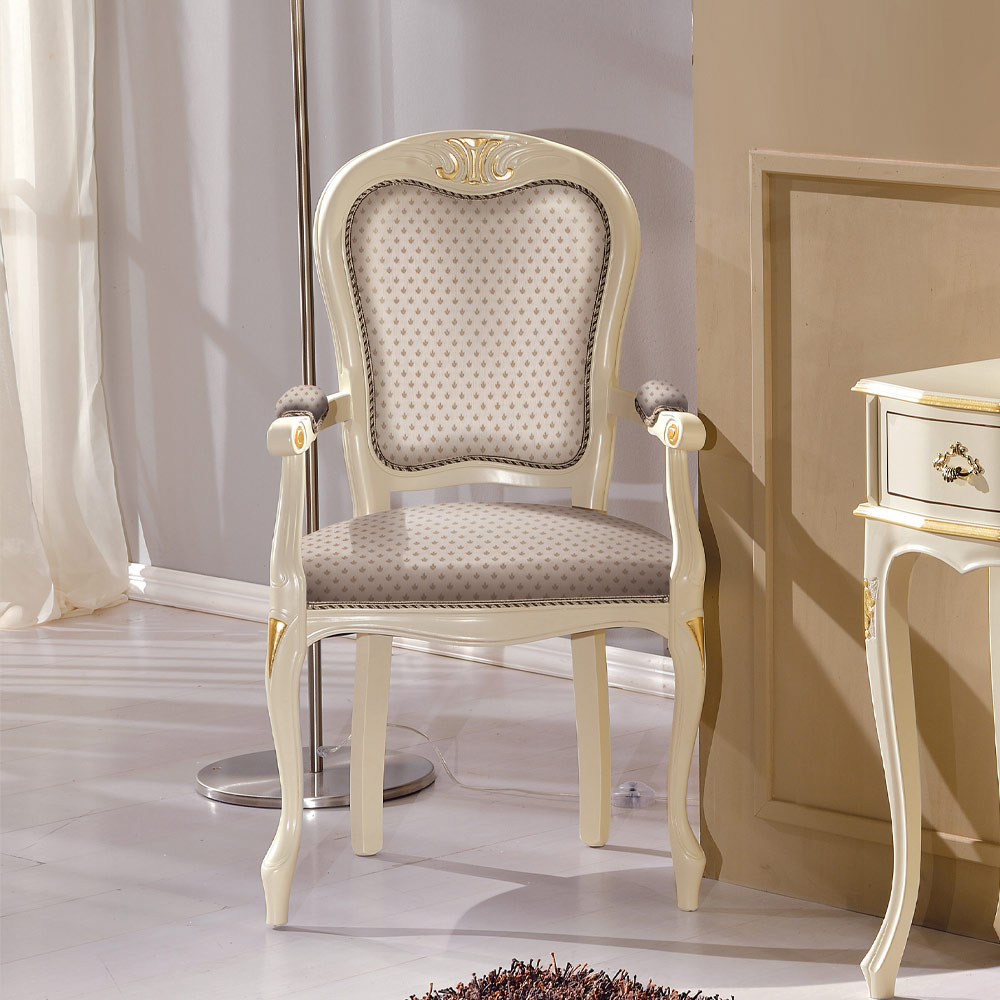Classic style head of the table chair made of precious wood in white finish with padded seat covered in fabric complete with practical and comfortable armrests. All the style and craftsmanship that characterize the workmanship emerge in this sumptuous furniture thus making it a refined complement capable of embellishing the environment in which it is placed. Completely made in Italy and handcrafted by skilled master craftsmen , finished with wisdom and taste for elegance. The production is carried out using fine materials , and performing the work by hand with the utmost care and professionalism that distinguishes Made in Italy products.