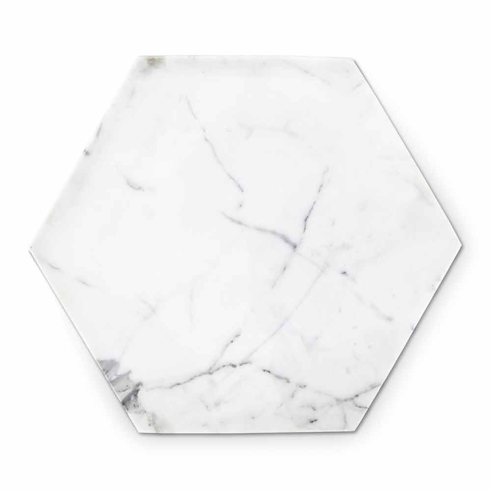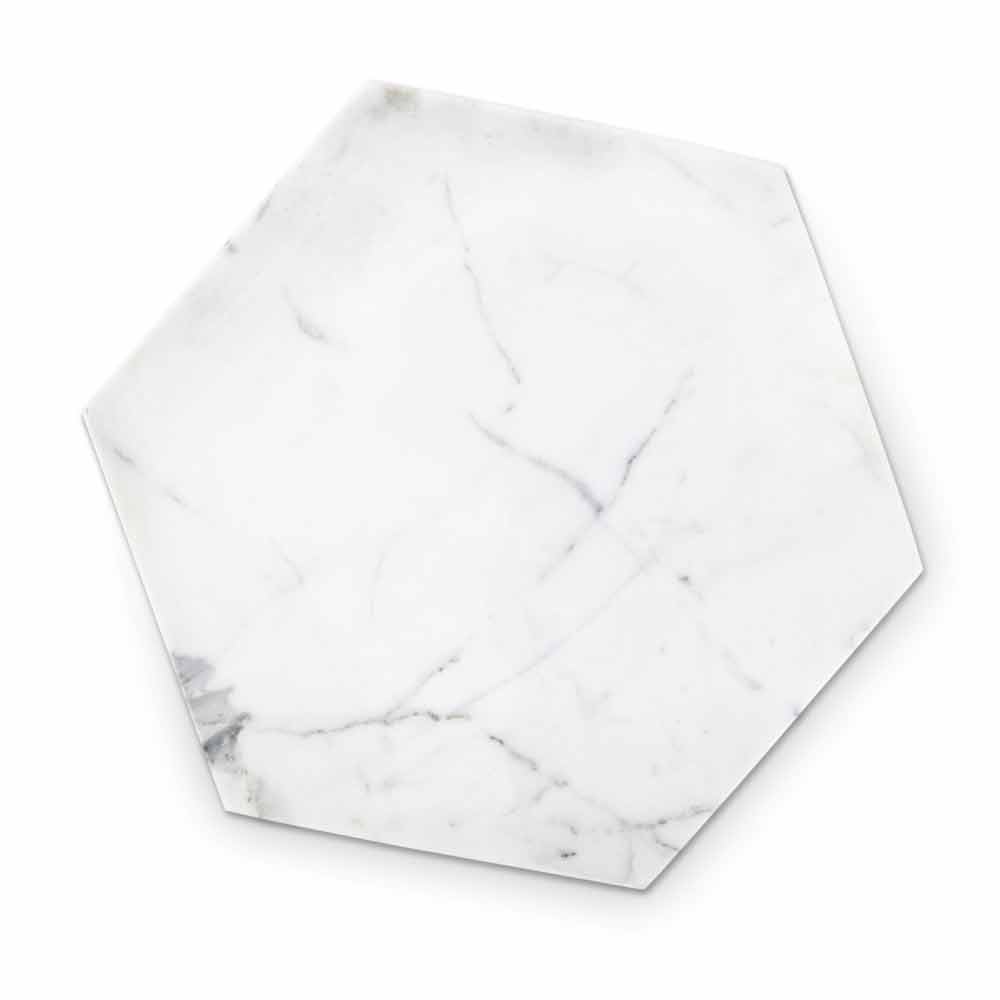 Hexagonal design plate in white Carrara marble Made in Italy.