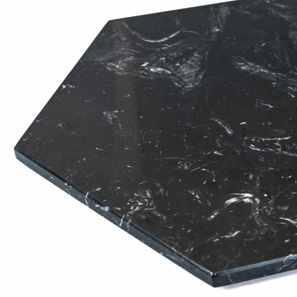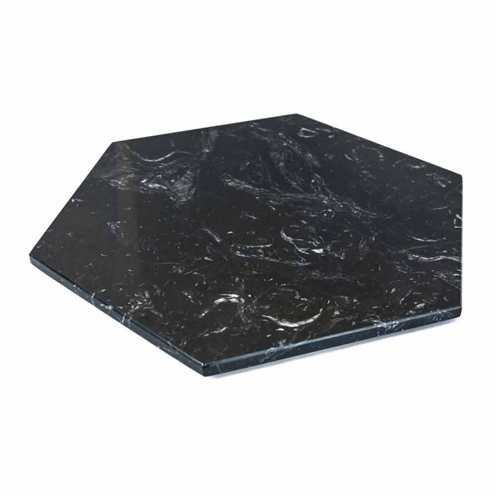 Modern hexagonal plate serving design realized in an elegant marble in two finishes with the underlying layer of cork and thanks to its innovative design can also be used as a tray or cutting board.