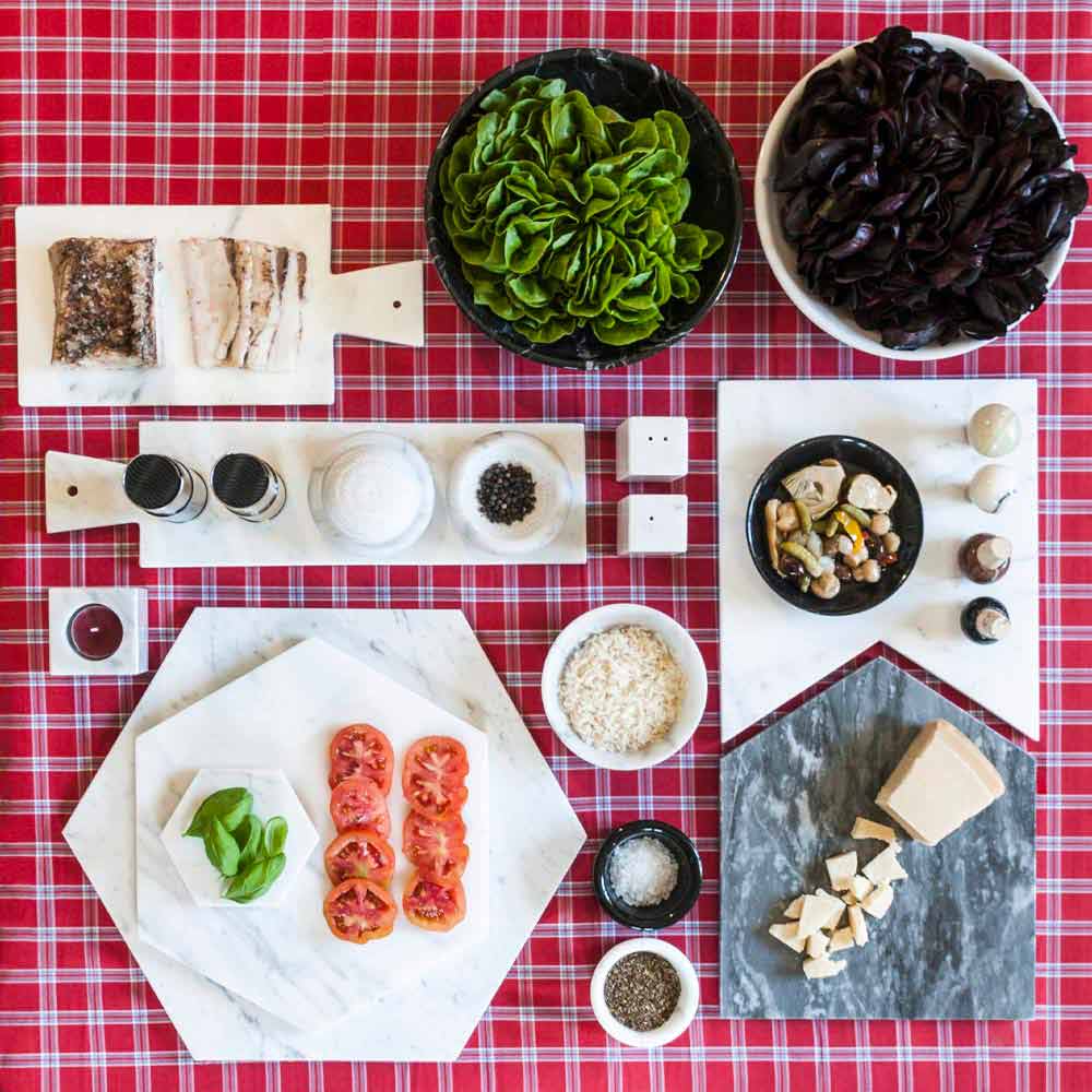 marble in two finishes which, thanks to its innovative design, it can also be used as a tray or cutting board.