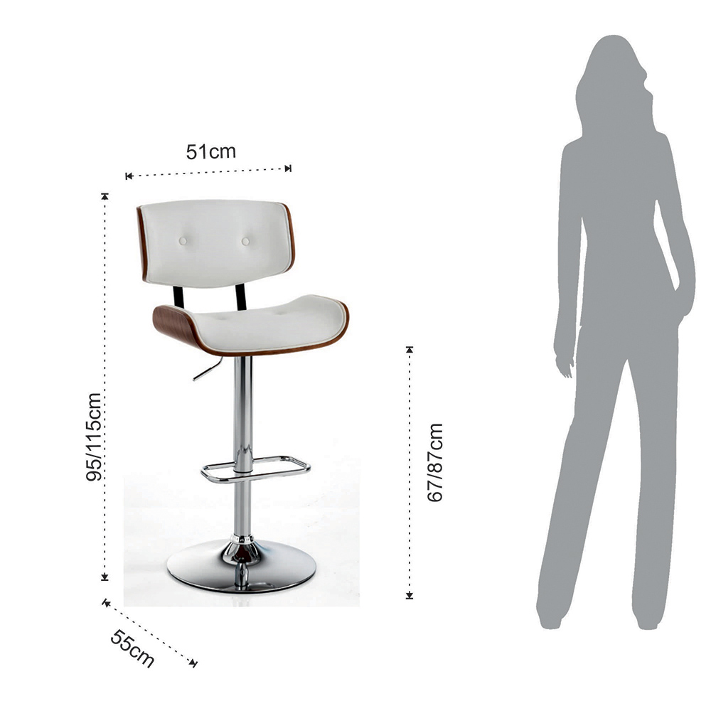 High kitchen stool with base made of chromed metal complete with practical footrest and seat and back in stained plywood, walnut finish and white synthetic leather . Its peculiarity is represented by the practical adjustable gas lift which allows you to customize the seat height up to a maximum of 87 cm. Its design is unique and captivating and is marked by soft shapes and rounded lines which ensure a comfortable and welcoming stool , therefore ideal for completing domestic environments such as kitchens or dining rooms but also bars and restaurants with a modern style. The wonderful combination between the imposing touch of wood and the timeless elegance of leather gives life to an original , avant-garde complement with a strong contemporary personality .