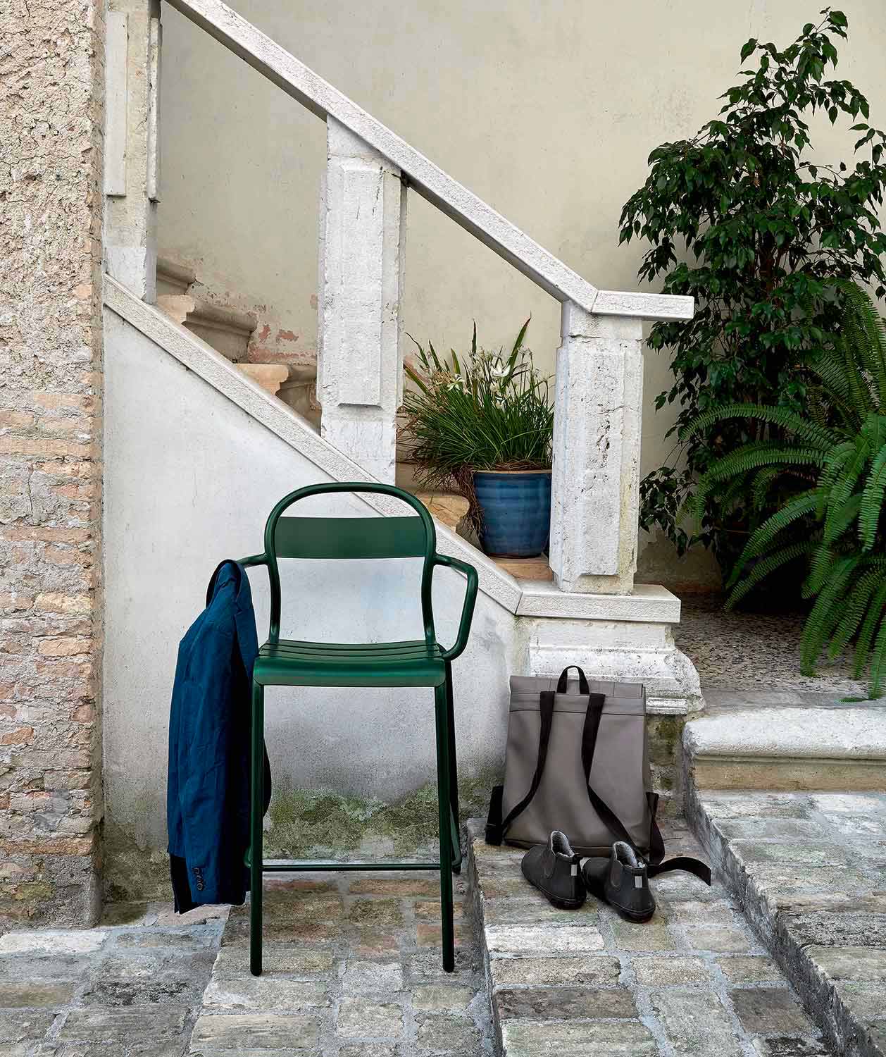 Selima is a high outdoor stool with a modern and elegant design characterized by a timeless and versatile design. The stool is entirely made of aluminum, which makes it perfect for use in high kitchens or bars both outside and inside, for domestic and non-domestic use and is equipped with armrests for greater comfort.