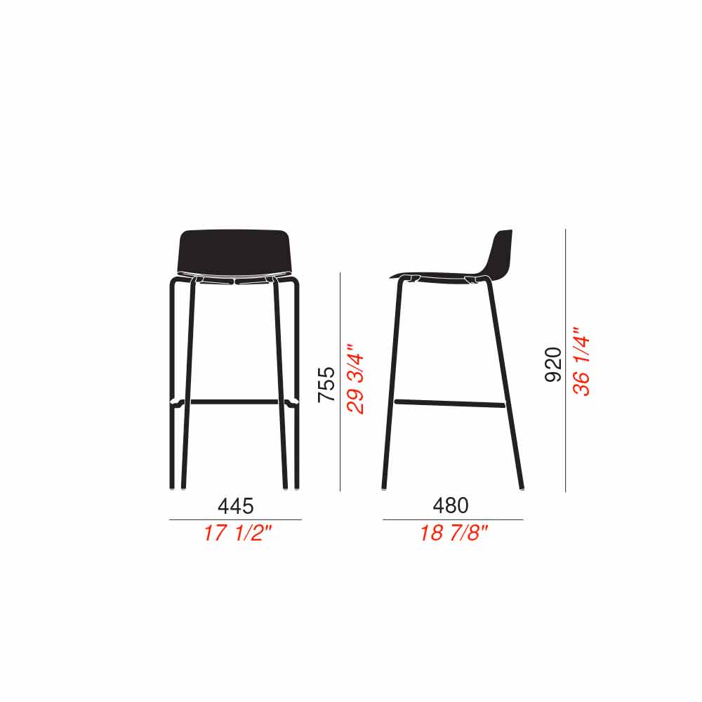 2 metal and polypropylene stools with stackable back Made in Italy.