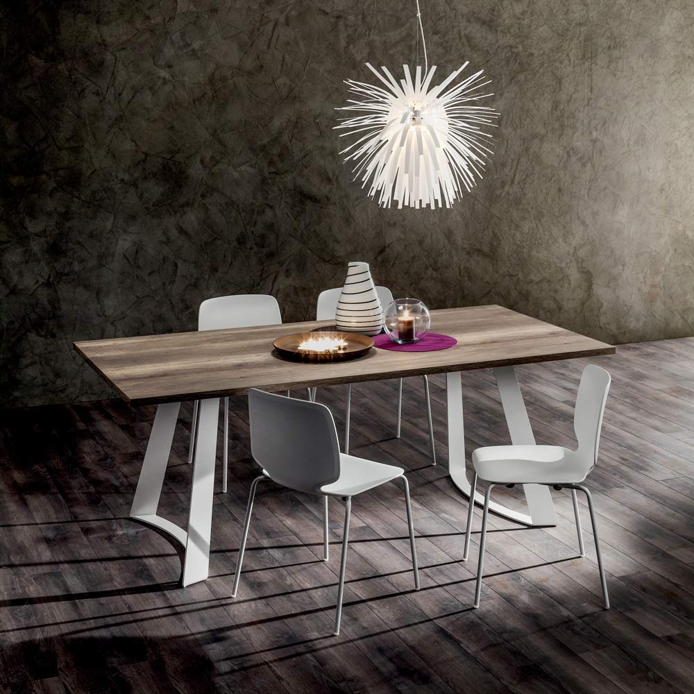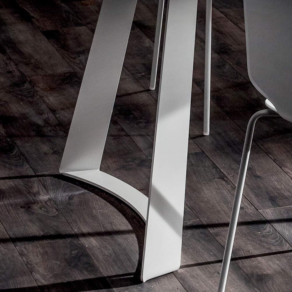 Dining table made in Italy with top in hpl laminate (thickness 30mm) and metal legs painted with epoxy powders in white finish. A table with simple and eclectic lines that easily adapts to any modern furnishing situation in which it creates a wonderful harmony with the surrounding style to obtain a warm and welcoming atmosphere . Its strong point is represented by the unusual shape of the legs which give the product an original and exclusive elegance . On the other hand, the top is given the role of true protagonist as it is able to enrich the aesthetics of the table with personality and an imposing and classy style. Thanks to the use of hpl, a material characterized by excellent resistance to chemical agents, abrasions and scratches, the table also offers a solid and robust surface capable of maintaining its aesthetic characteristics unchanged over time.