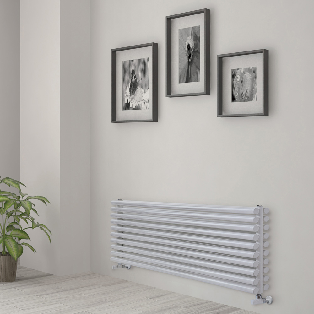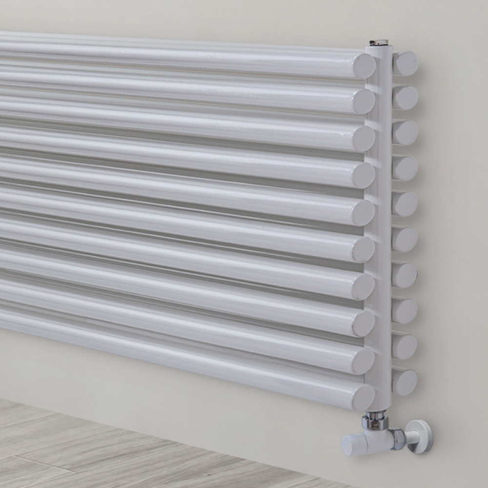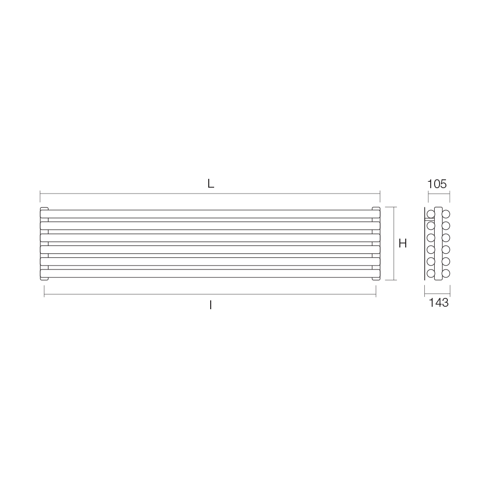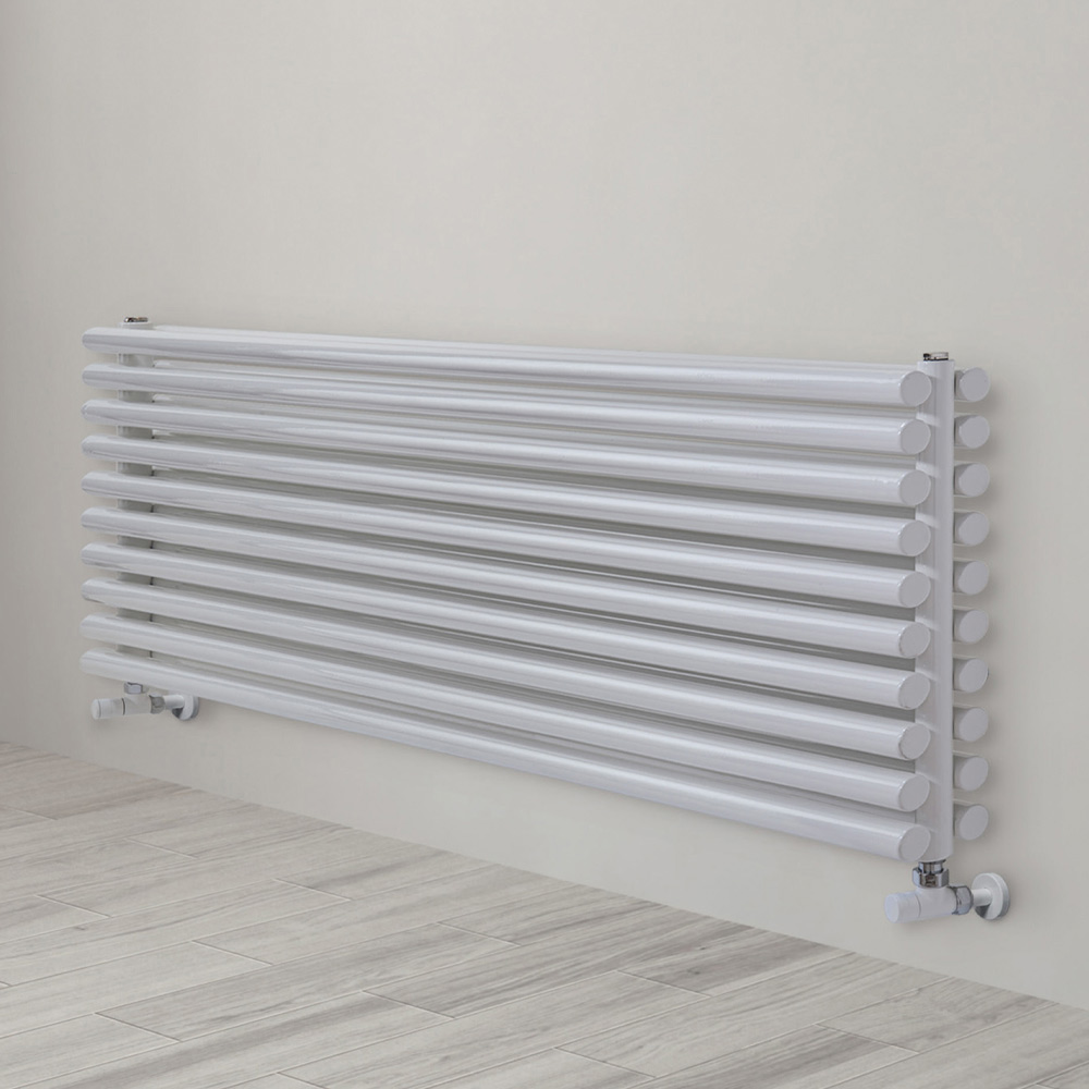 Hydraulic radiator in carbon steel with a pure glossy white finish consisting of a double series of horizontal elements with a diameter of 3.5 cm welded onto vertical manifolds with a diameter of 3.5 cm entirely made in Italy with wall fixing kit, vent valve and blind plug included .