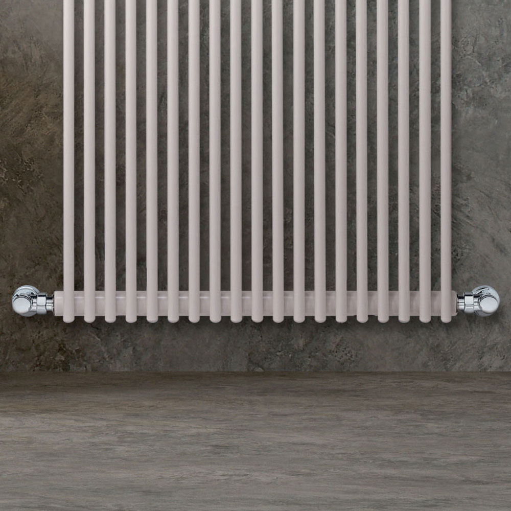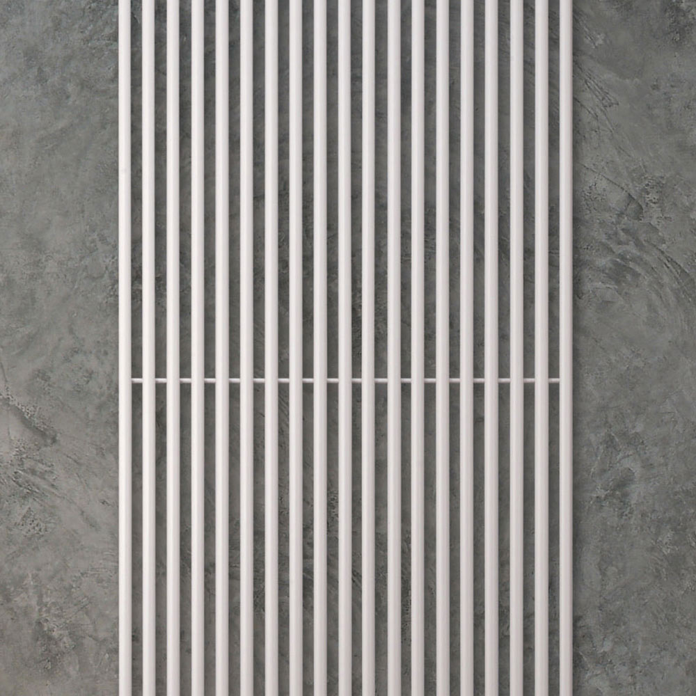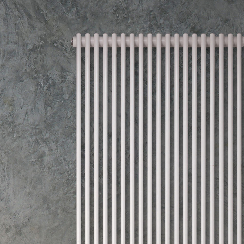Hydraulic radiator in carbon steel with a cream white finish consisting of a series of vertical elements with a diameter of 1.6 cm welded onto horizontal manifolds with a diameter of 3.5 cm. Entirely made in Italy with wall fixing kit, vent valve and blind plug included .