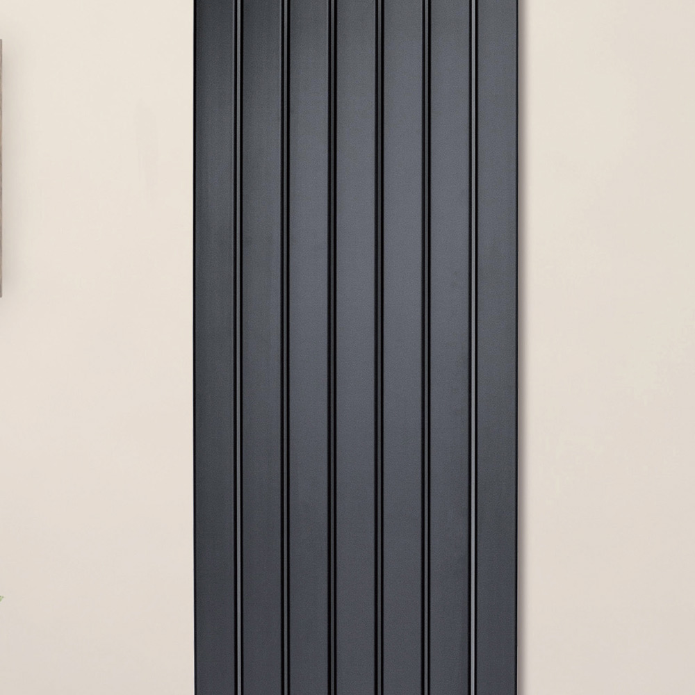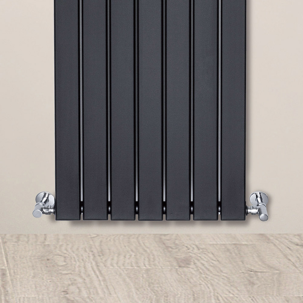 Hydraulic radiator in carbon steel with jet black finish consisting of a series of flat vertical elements measuring 7x1.1 cm welded onto horizontal manifolds with a diameter of 3.5 cm entirely made in Italy with wall fixing kit, vent valve and blind plug included .