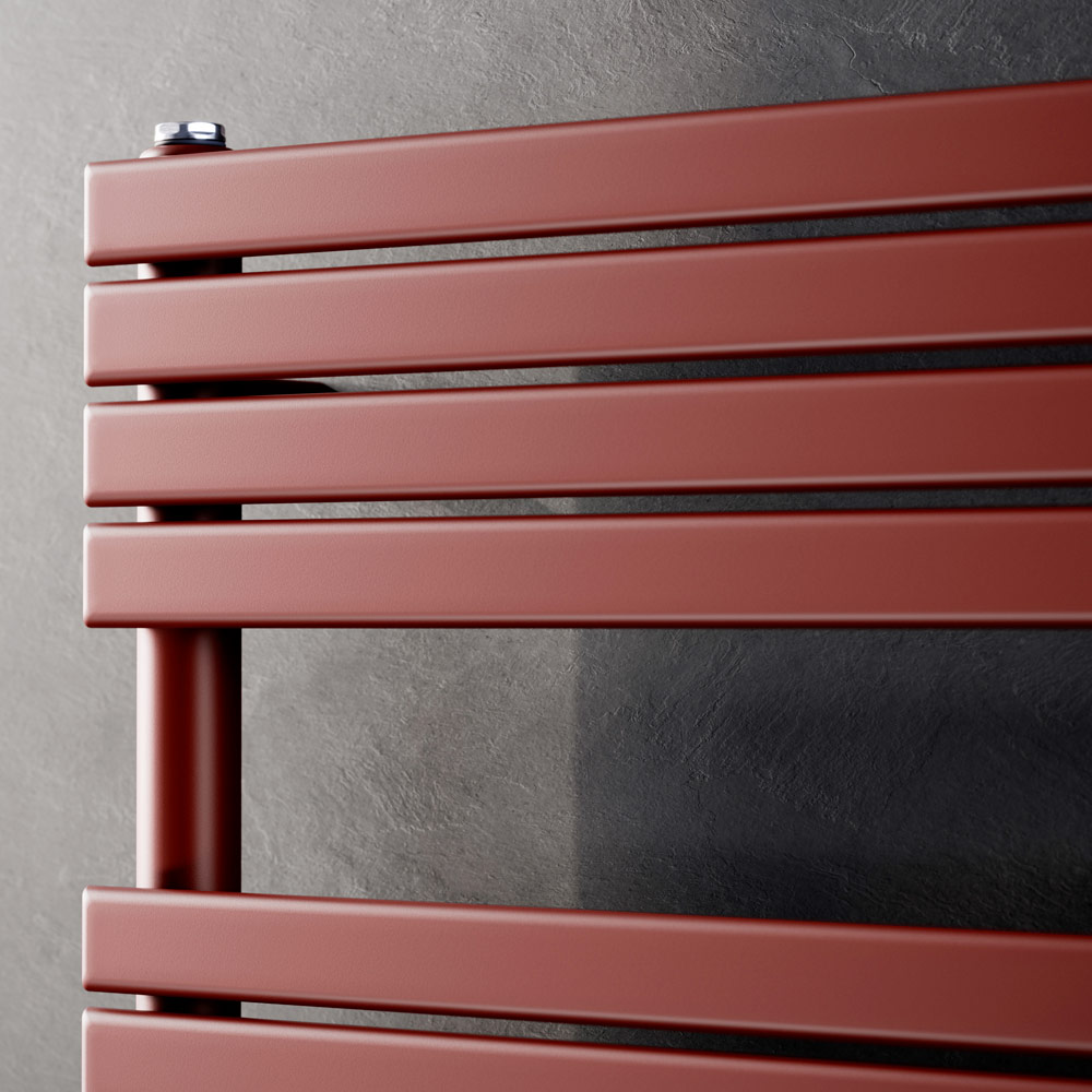 Hydraulic towel warmer made of carbon steel with a matt rust finish, consisting of 35x11 mm horizontal flat tubes and 35 mm diameter manifolds, entirely Made in Italy.