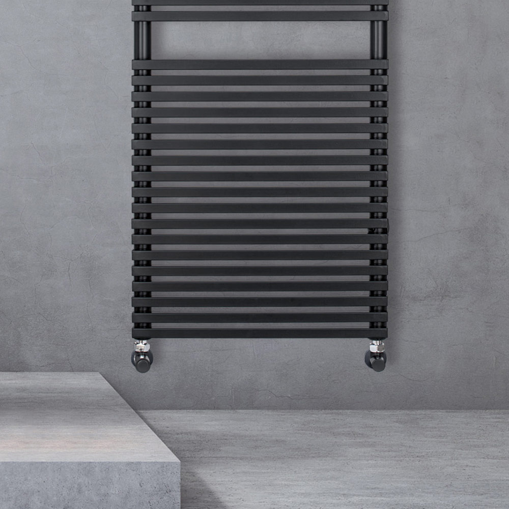 Hydraulic towel warmer in jet black finish carbon steel consisting of a series of horizontal elements with a 2 cm square section welded onto vertical manifolds with a diameter of 3.5 cm, entirely made in Italy with wall fixing kit, vent valve and blind plug included .