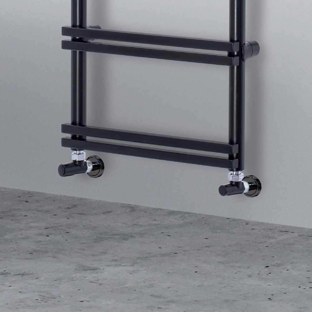 Hydraulic towel warmer in jet black finish carbon steel consisting of a series of horizontal elements with a 2 cm square section welded onto vertical manifolds with a diameter of 3.5 cm, entirely made in Italy with wall fixing kit, vent valve and blind plug included .