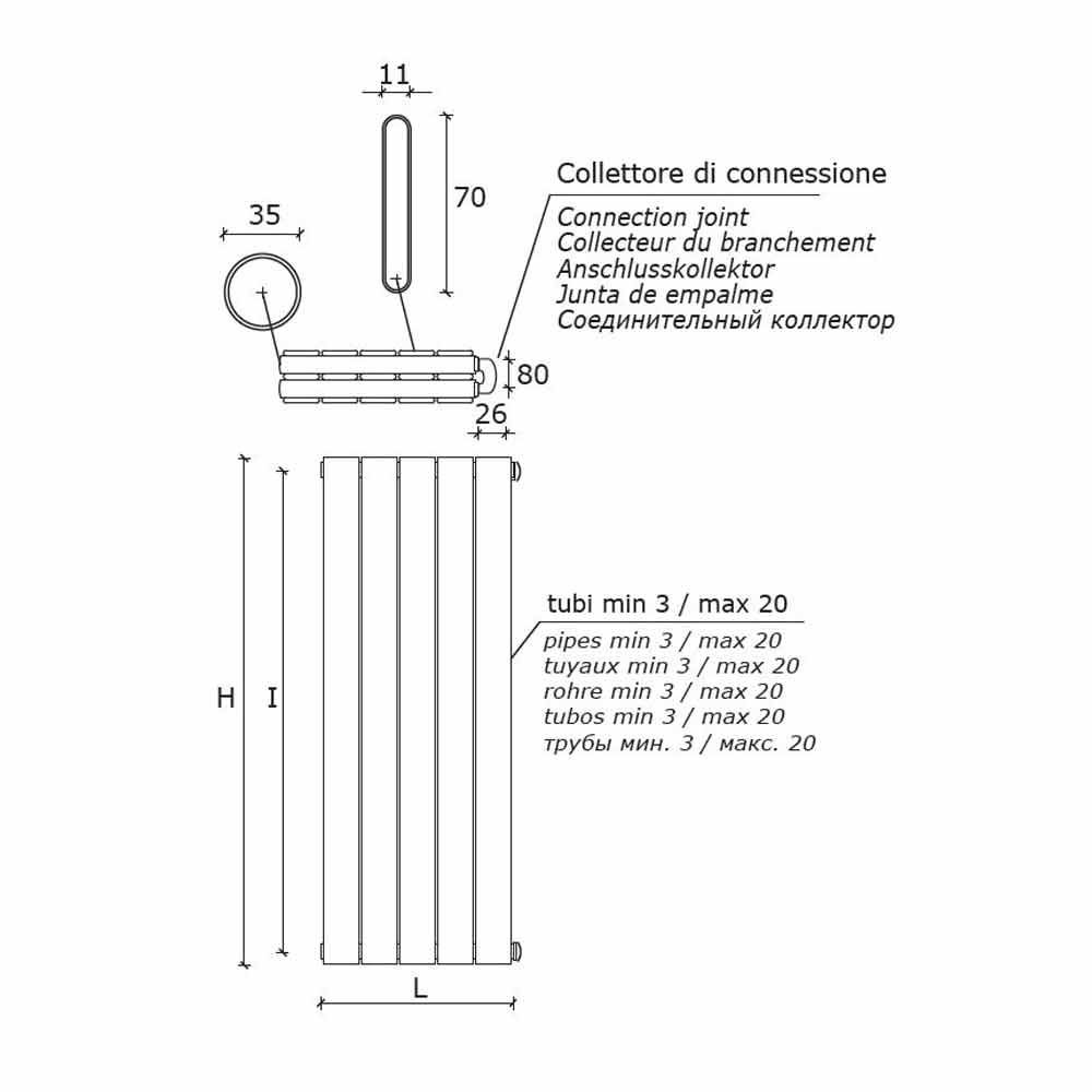 This radiator features a design consisting of 70x11mm vertical flat tubes and 35mm diameter manifolds.