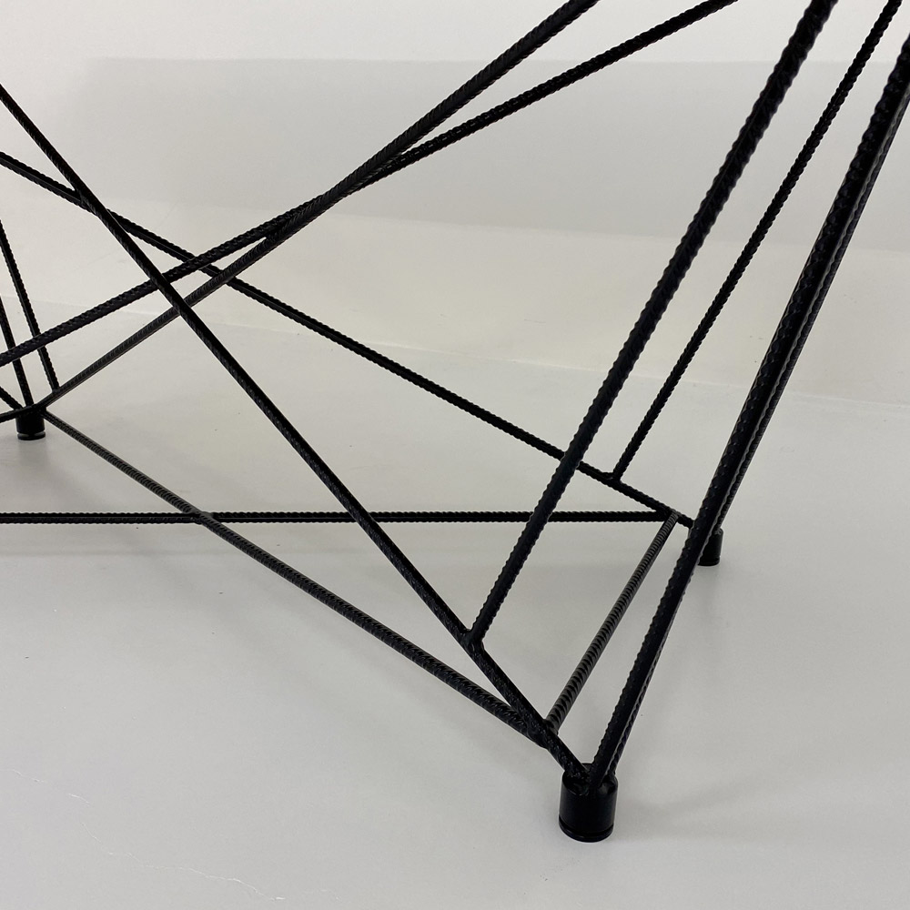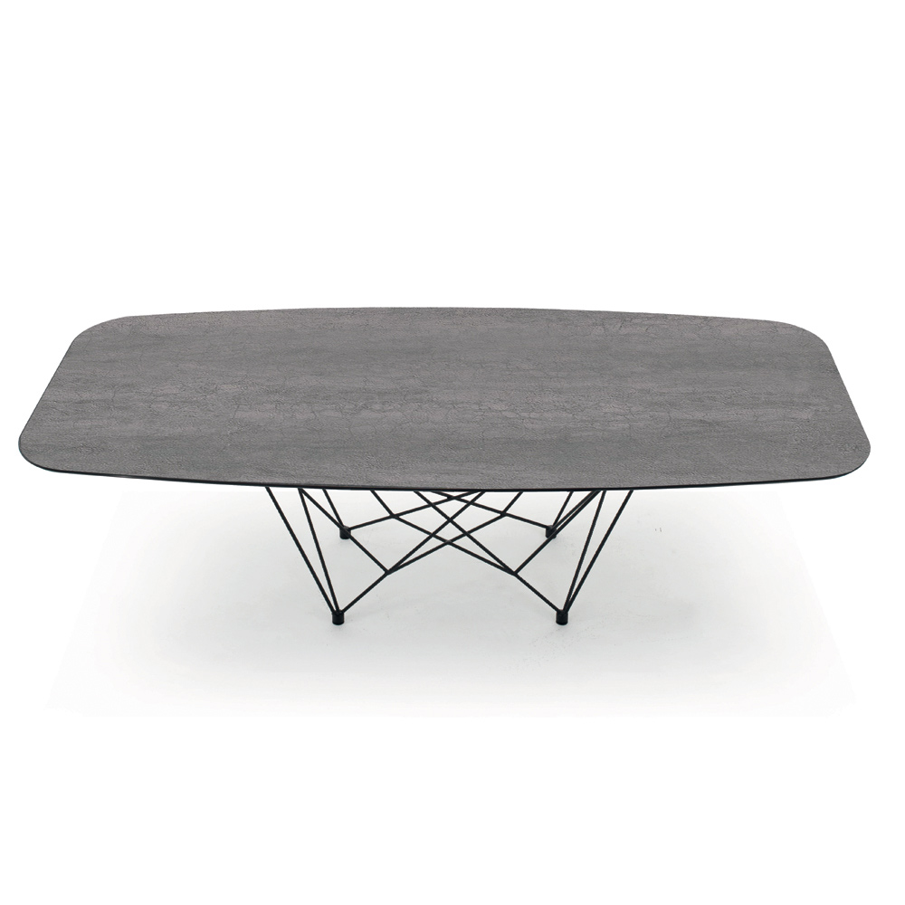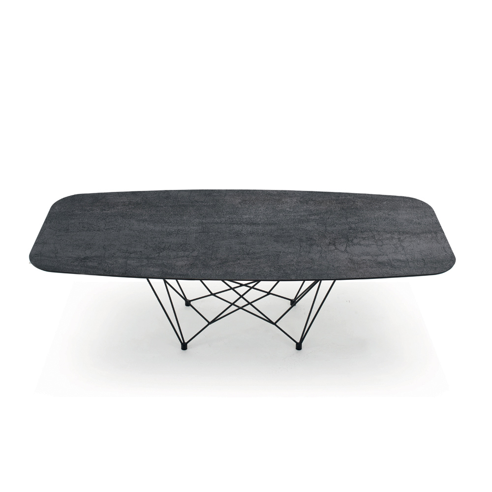 Barrel-shaped dining table in laminam ceramic and black steel Made in Italy.