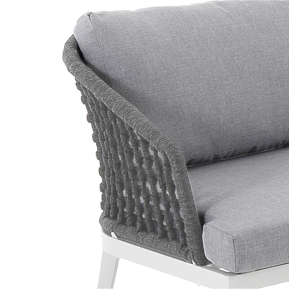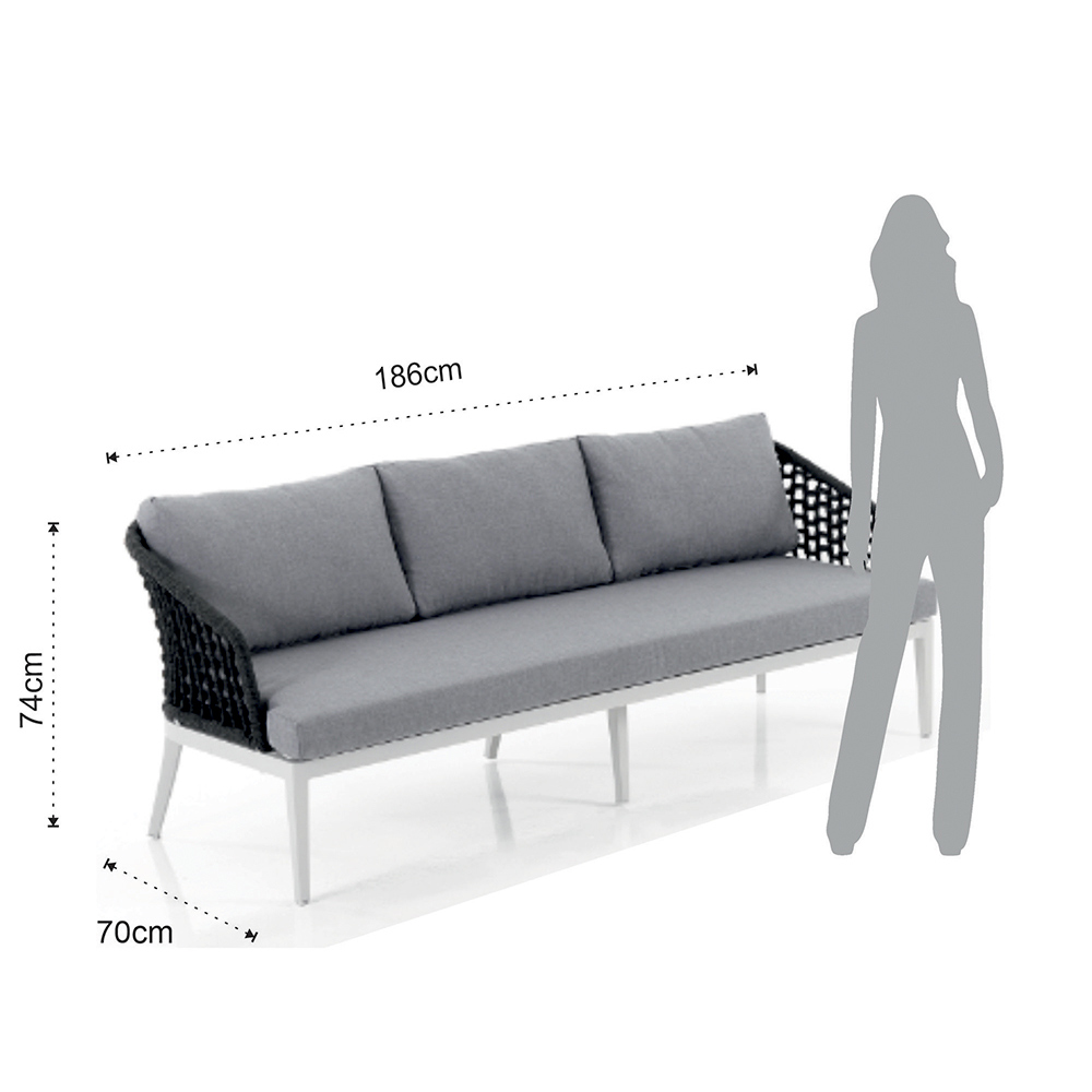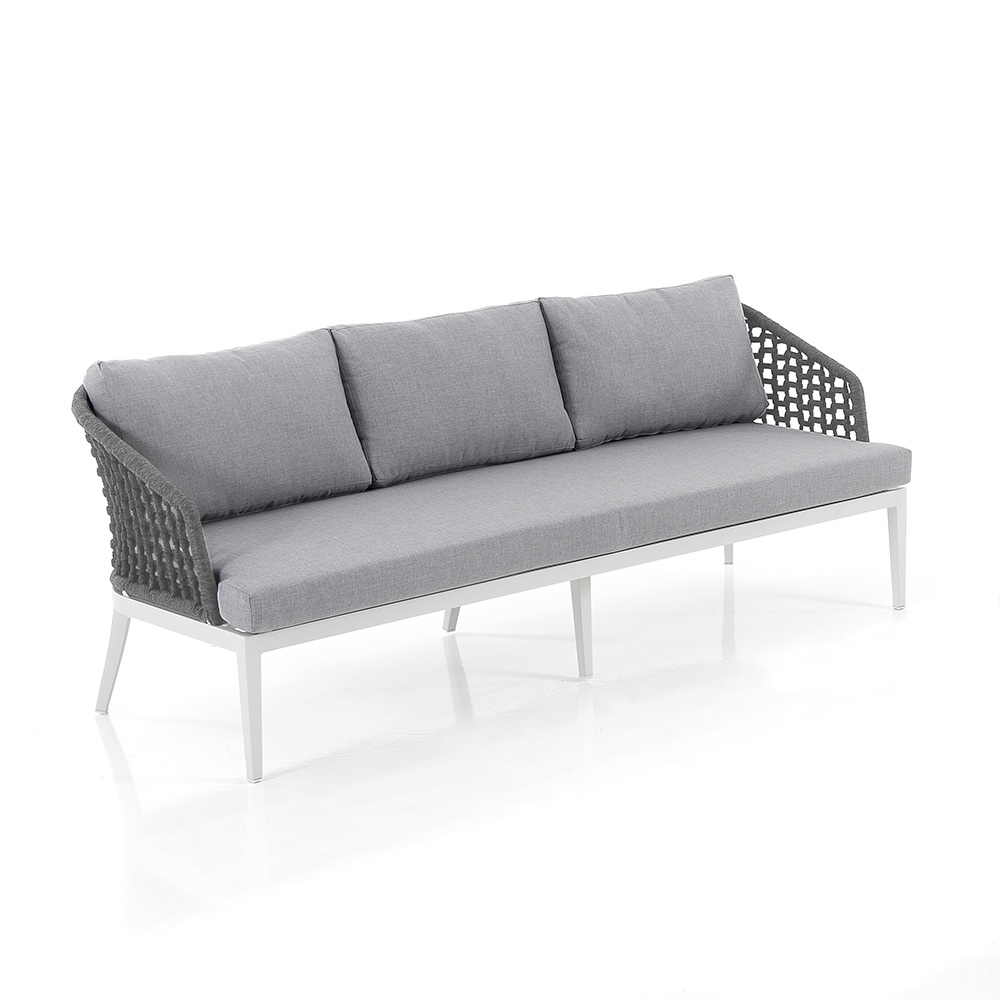 Outdoor and indoor sofa made with matt white aluminum structure, removable cushions covered in light gray 310g polyester , internal foam padding (h.9 cm seat) and backrest covering in dark gray woven polypropylene fibre .