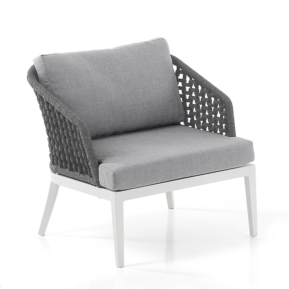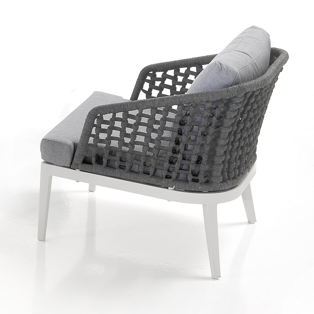 Includes 2 armchairs made with a matt white aluminum structure, removable cushions covered in light gray 310g polyester , internal foam padding (h.9 cm seat) and backrest covering in dark gray woven polypropylene fibre .