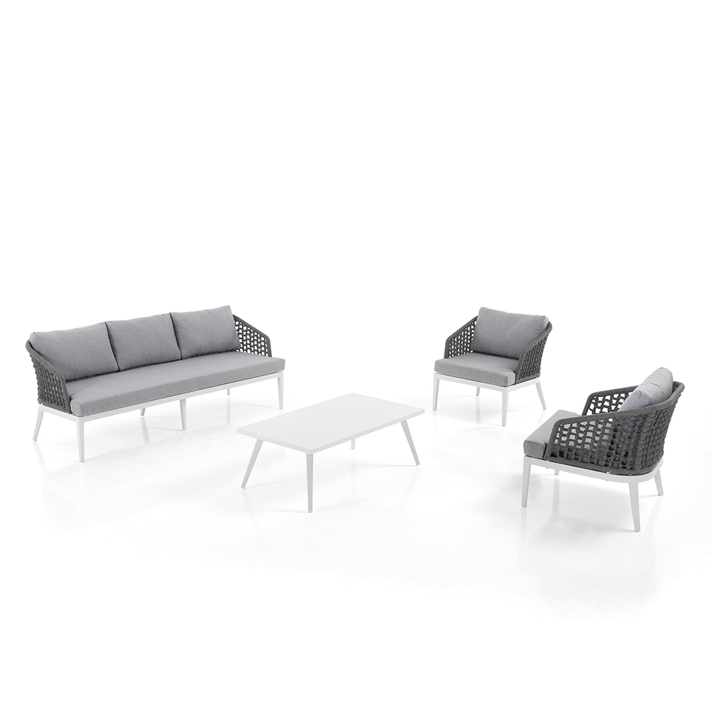 This lounge with coffee table for the garden is an example of refined design and comfort . The combination of the armchairs and the sofa with their weaving on an aluminum structure gives an elegant and contemporary look, perfect for adding a touch of class to any outdoor space.