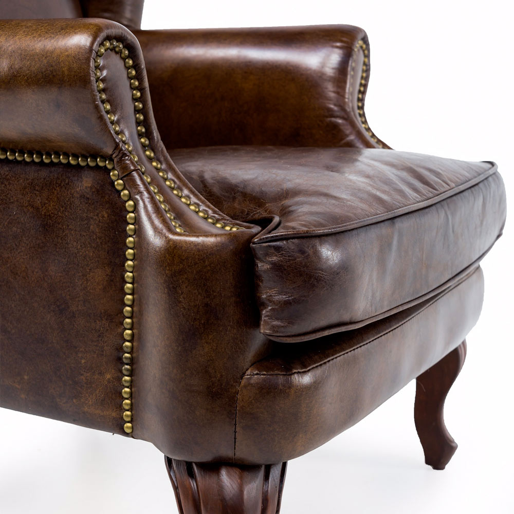 Reading room armchair in true leather dark brown color, with a classic English style.