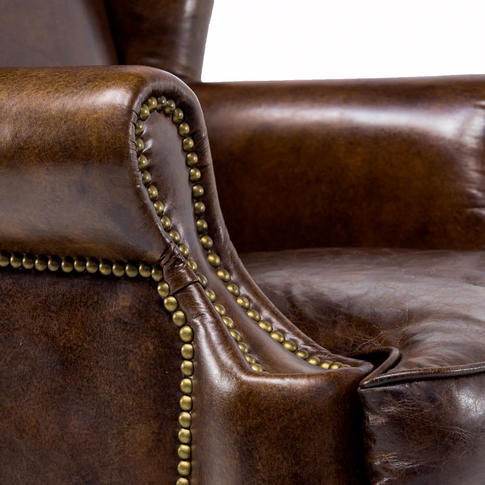 This armchair is part of a collection that canò boast abeauty and timeless taste that resists the passing of fashions and suggestions of trends. Sturdy and sturdy structures, capitonnée workmanship, hand punching and nailing, real leather (leather flower) upholstery, worked with a special tanning specially designed to give the leather a vintage, aged look. The products in this collection are distinguished by the refined importance of the shapes and theprecious materials that animate them. They are seats that prove to be perfect for embellishing high-end furnishing environments that make elegance and character their prerogative.