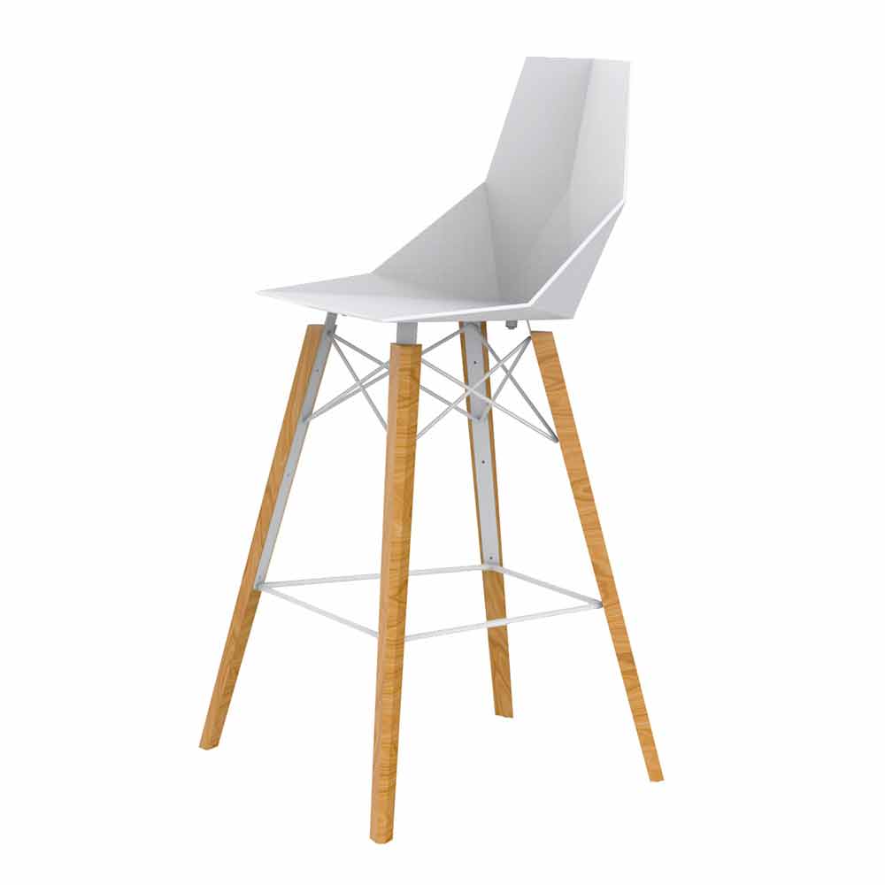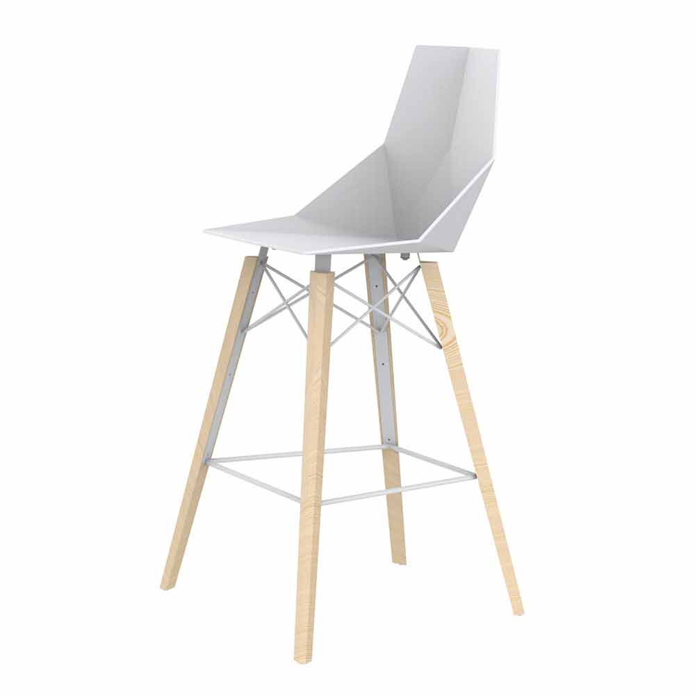 Bar stool with structure in ash wood and seat and back in polypropylene in various colors.