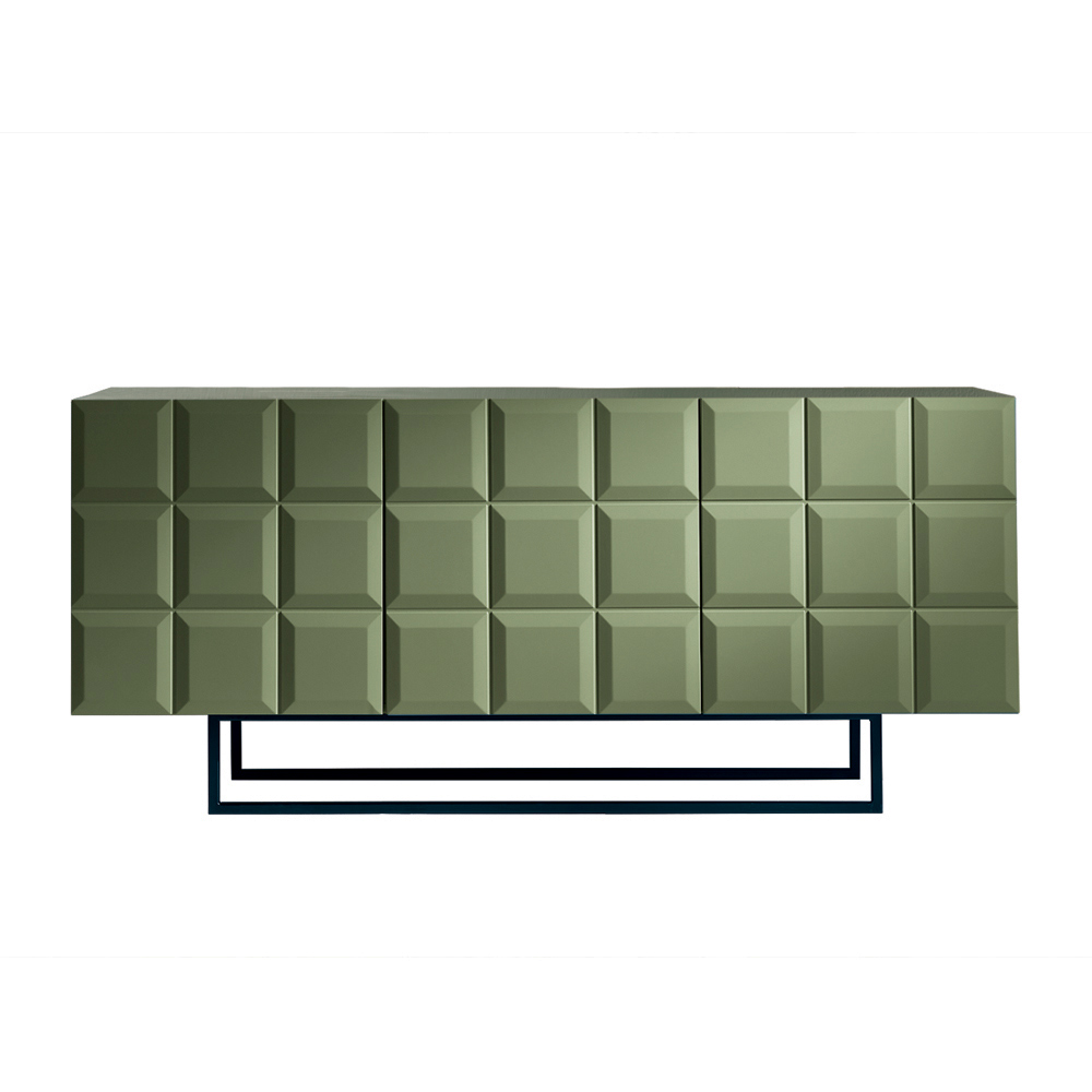 The melamine-faced body pairs with a painted metal base , available in various configurations, which streamlines the structure and lends visual lightness. The sideboard can be completed with a mirrored glass top for an even more sophisticated effect.