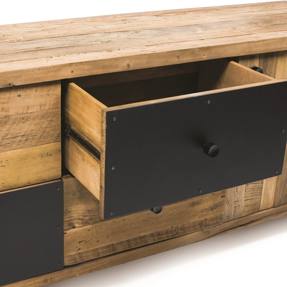 Interior sideboard made of recycled wood coffee natural color with 1 door, 2 wood front drawers, 2 black metal front drawers and metal feet.