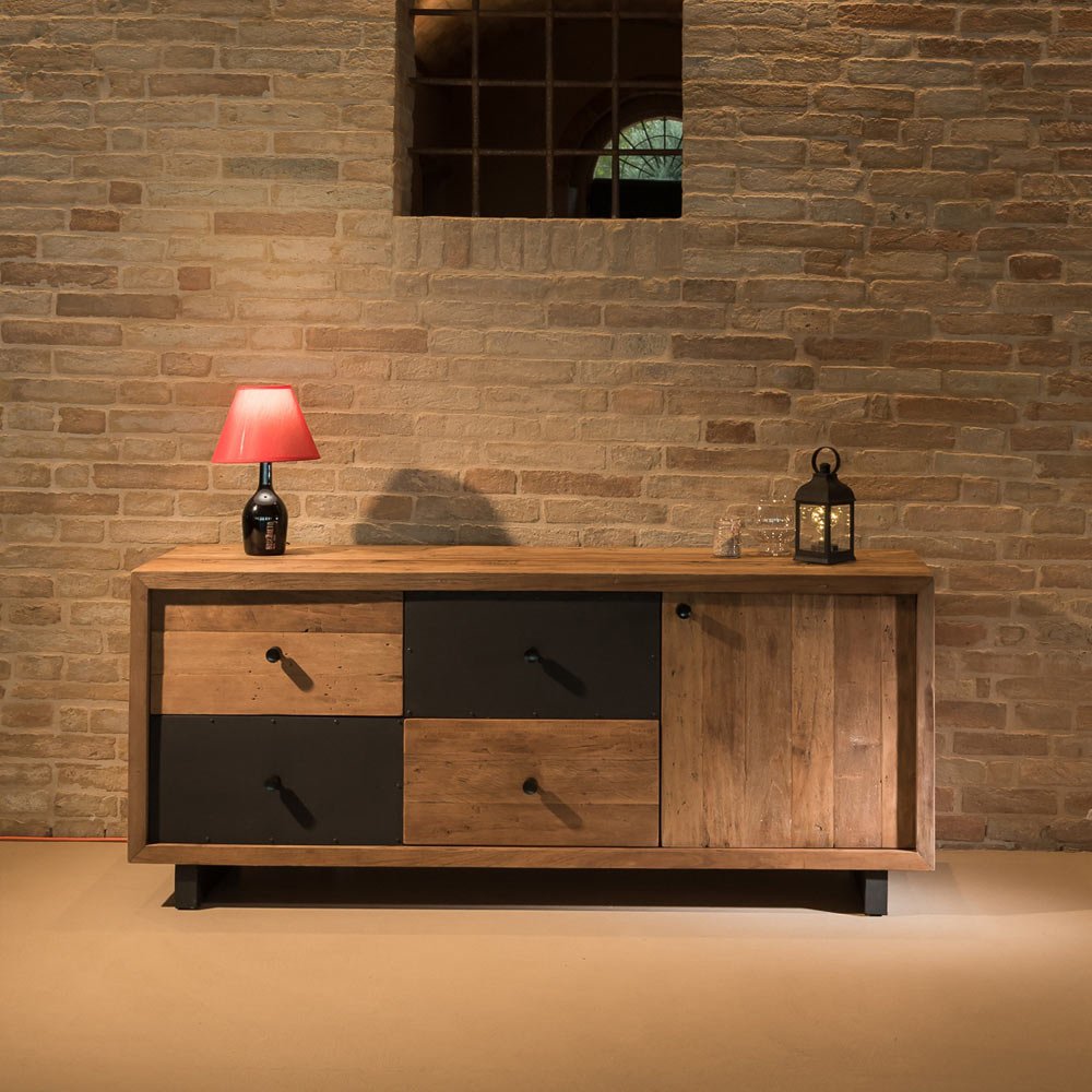 This furniture set è literally unique precisely because it encloses within itself the peculiar history of the lived-in material. The workmanship is largely done according to handcrafted procedures. Every nick and imperfection, every scar on the wood, testifies to the originality of a past that is given new life. The recycled tropical wood legally from old artifacts, boats and abandoned buildings is expertly treated and brushed in order to regain dignity and luster. This product combines the’essence of rustic taste with the forms of contemporary design and with some details of the industrial style.
