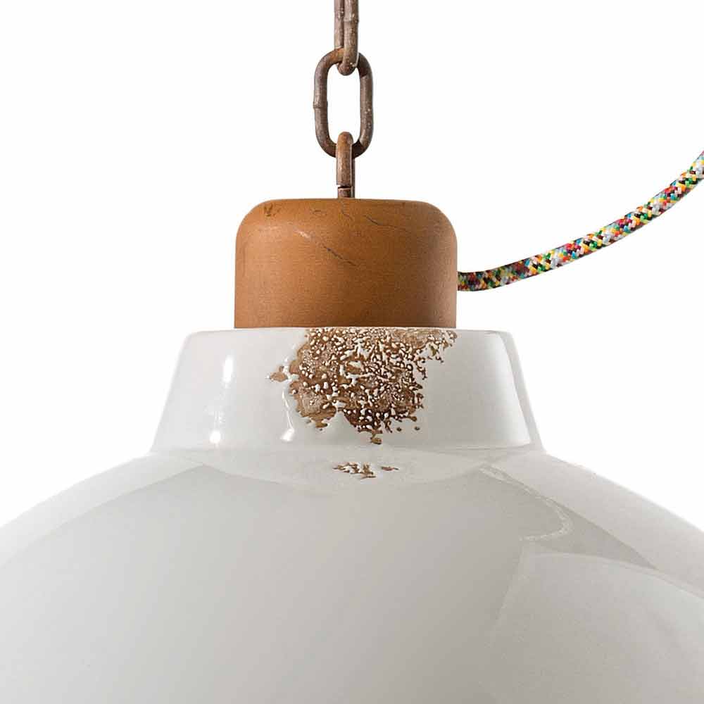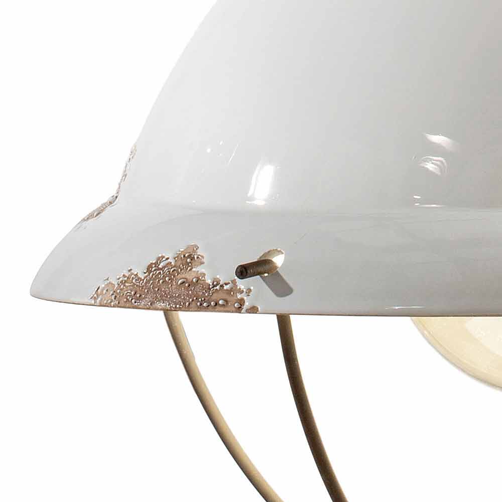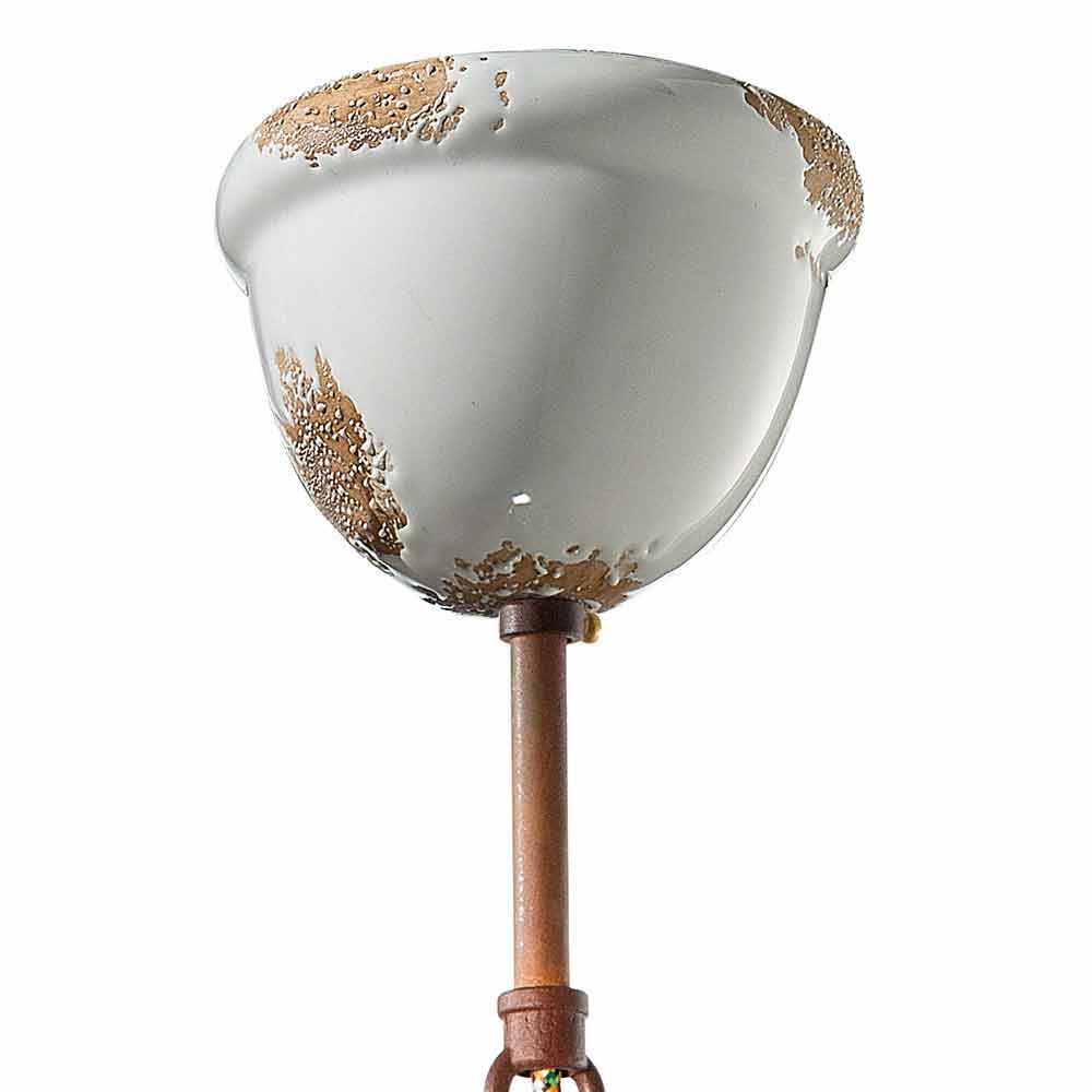 The peculiarity of this lamp lies in the craftsmanship of the ceramic diffuser. The ceramic, in fact, is decorated in such a way as if time had marked its path. The reproduction of the erosion of time combined with the shiny surfaces give that extra value to this suspension. This time-worn effect gives Clara a sophisticated vintage-industrial style. The metal structure amplifies even more the antique effect.