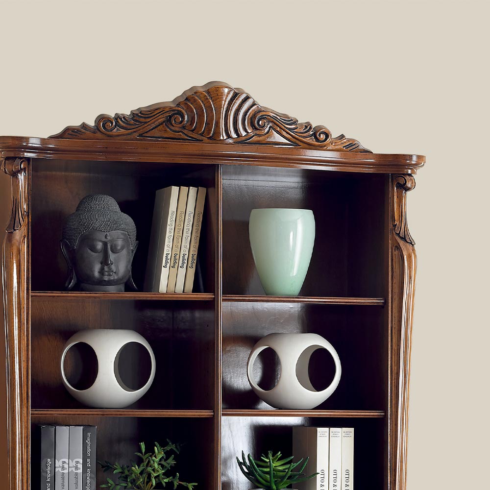 Elegant classic style bookcase made of inlaid Bassano walnut wood . This bookcase has 8 practical compartments and two doors, all crowned by the original coping. Ā A unique and refined complement, completely made in Italy by skilled master craftsmen , masters of art who finish each complement with wisdom and taste for elegance. The production is carried out using fine materials , and performing the work by hand with the utmost care and professionalism that distinguishes Made in Italy products.