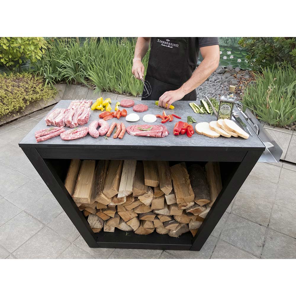 worktop in porcelain stoneware is 90 cm tall and will allow you an additional space where you can prepare meat and vegetables for your kitchen or BBQ.