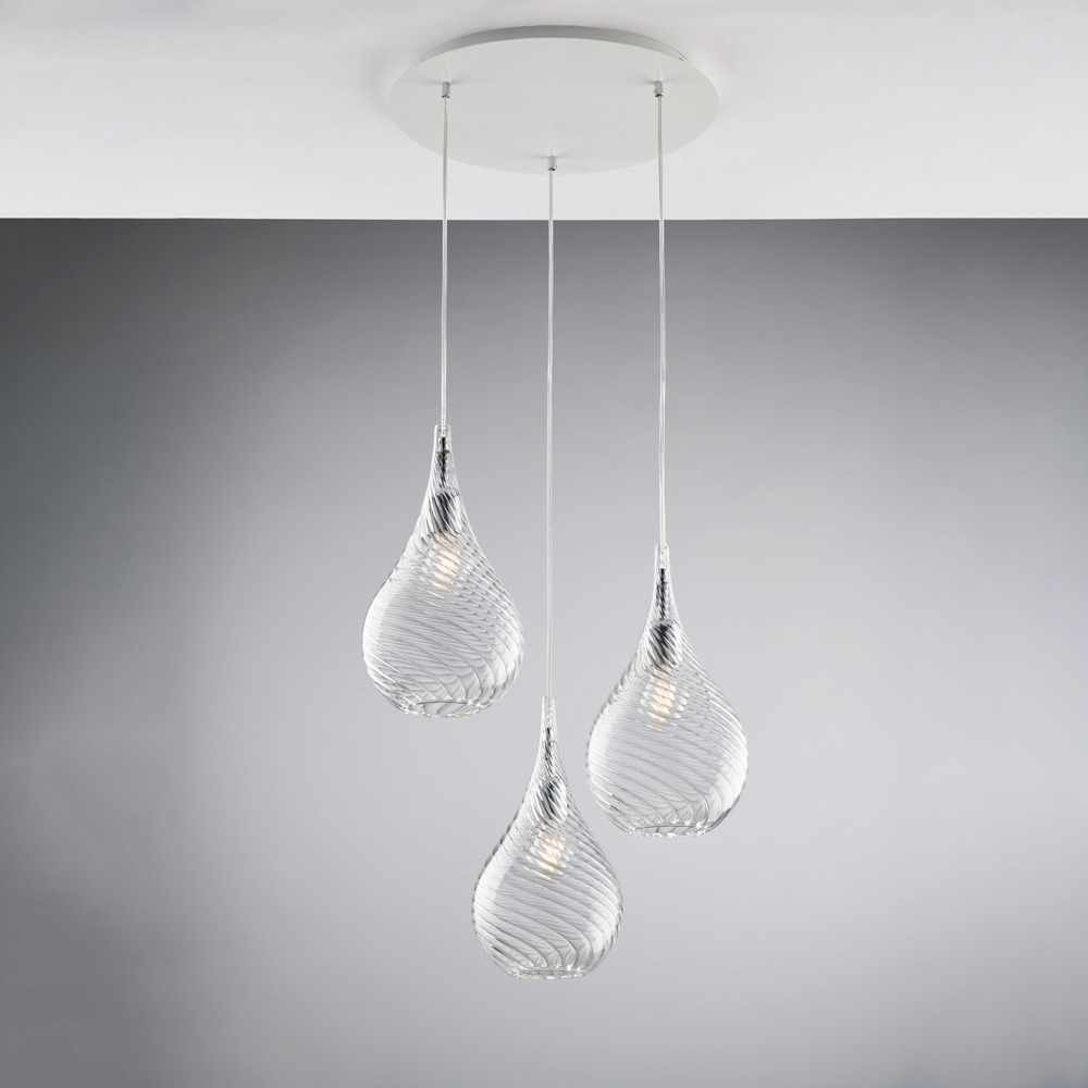 Elegant and luminous, this handcrafted iron pendant with Pyrex glass is a contemporary and refined lighting solution. The three soft, sinuous Pyrex glass diffusers diffuse the light evenly and delicately, creating a welcoming and sophisticated atmosphere.